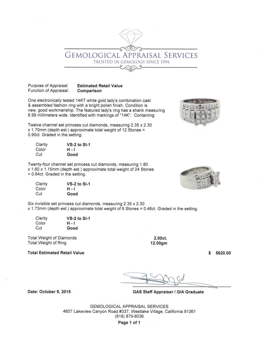 One electronically tested 14KT white gold lady's combination cast & assembled fashion ring with a bright polish finish. The featured lady's ring has a shank measuring 6.99 millimeters wide. Identified with markings of "14K". Condition is new, good workmanship. Containing: Twelve channel set princess cut diamonds, measuring 2.35 x 2.30 x 1.70mm (depth est.) approximate total weight of 12 Stones = 0.90ct. Graded in the setting. Clarity: VS-2 to SI-1. Color: H - I. Cut Good Twenty-Four channel set princess cut diamonds, measuring 1.80 x 1.60 x 1.15mm (depth est.) approximate total weight of 24 Stones = 0.64ct. Graded in the setting. Clarity: VS-2 to SI-1. Color: H - I. Cut Good Six invisible set princess cut diamonds, measuring 2.35 x 2.30 x 1.73mm (depth est.) approximate total weight of 6 Stones = 0.46ct. Graded in the setting. Clarity: VS-2 to SI-1. Color: H - I. Cut Good. Total Weight of Diamonds 2.00ct. Total Weight of Ring 12.00gm. GAS Appraised at $5,620.00.