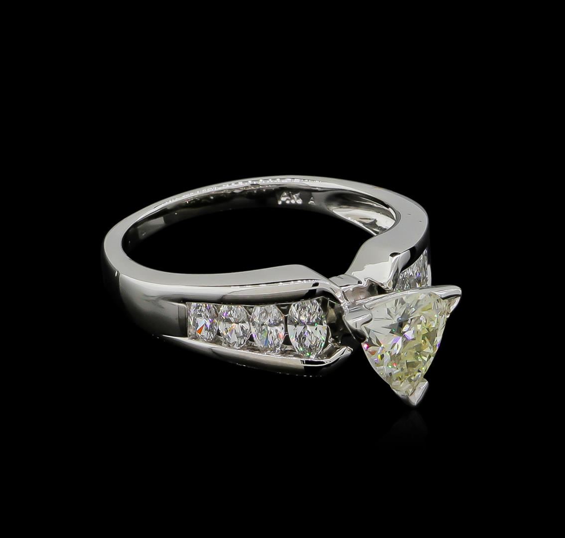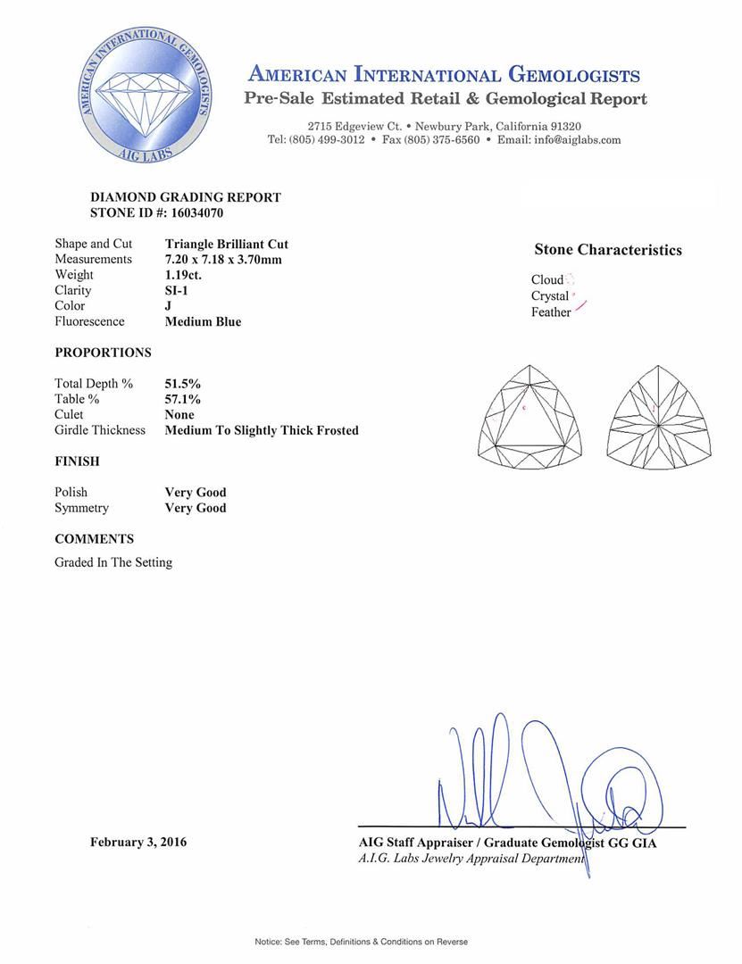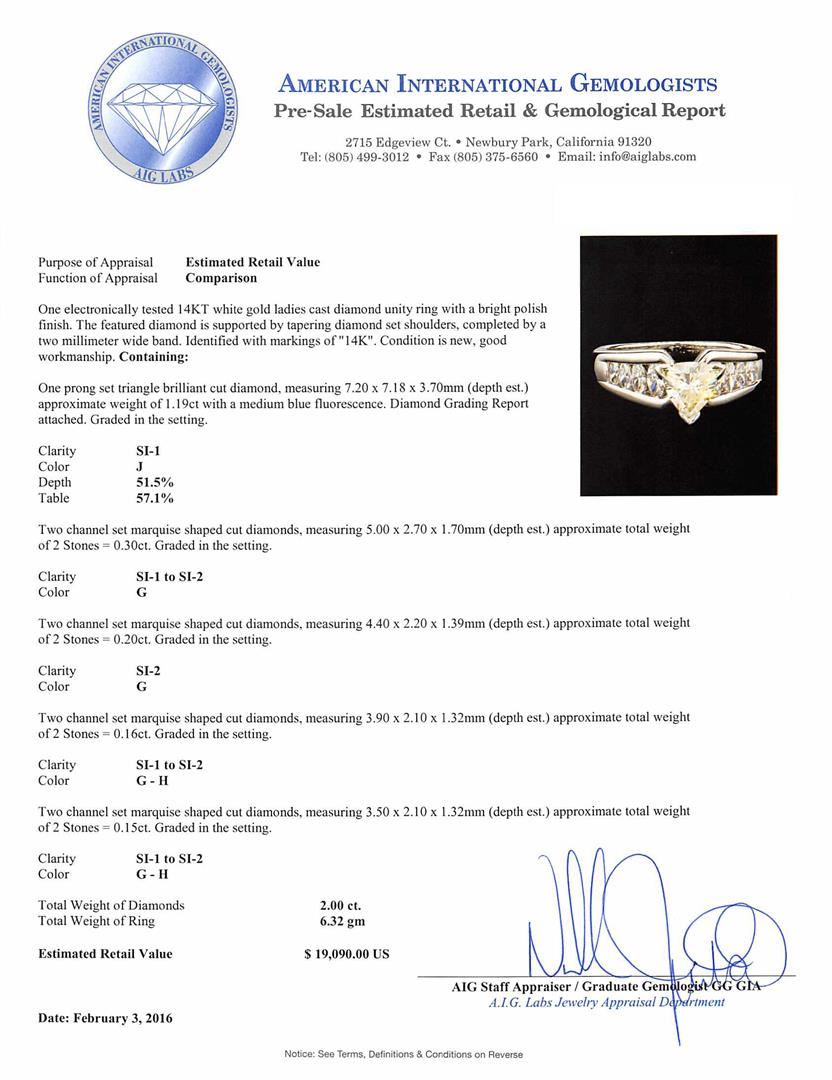 One electronically tested 14KT white gold ladies cast diamond unity ring with a bright polish finish. The featured diamond is supported by tapering diamond set shoulders, completed by a two millimeter wide band. Identified with markings of "14K". Condition is new, good workmanship. Containing: One prong set triangle brilliant cut diamond, measuring 7.20 x 7.18 x 3.70mm (depth est.) approximate weight of 1.19ct with a medium blue fluorescence. Diamond Grading Report attached. Graded in the setting. Clarity: SI-1. Color: J. Depth 51.5%. Table 57.1%. Two channel set marquise shaped cut diamonds, measuring 5.00 x 2.70 x 1.70mm (depth est.) approximate total weight of 2 Stones = 0.30ct. Graded in the setting. Clarity: SI-1 to SI-2. Color: G Two channel set marquise shaped cut diamonds, measuring 4.40 x 2.20 x 1.39mm (depth est.) approximate total weight of 2 Stones = 0.20ct. Graded in the setting. Clarity: SI-2. Color: G Two channel set marquise shaped cut diamonds, measuring 3.90 x 2.10 x 1.32mm (depth est.) approximate total weight of 2 Stones = 0.16ct. Graded in the setting. Clarity: SI-1 to SI-2. Color: G - H Two channel set marquise shaped cut diamonds, measuring 3.50 x 2.10 x 1.32mm (depth est.) approximate total weight of 2 Stones = 0.15ct. Graded in the setting. Clarity: SI-1 to SI-2. Color: G - H. Total Weight of Diamonds 2.00ct. Total Weight of Ring 6.32gm. AIG Appraised at $19,090.00.