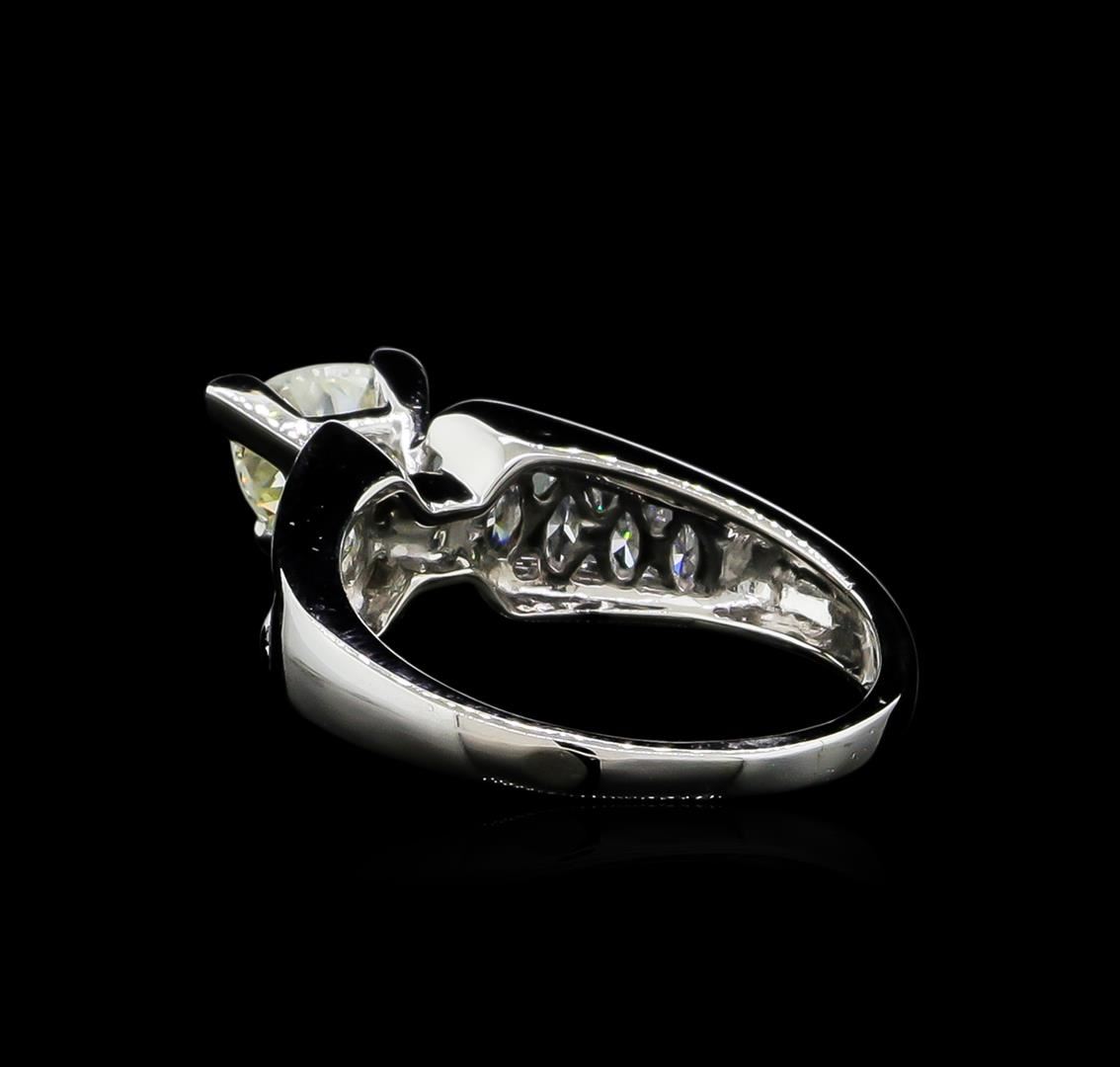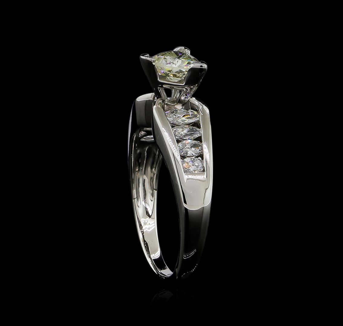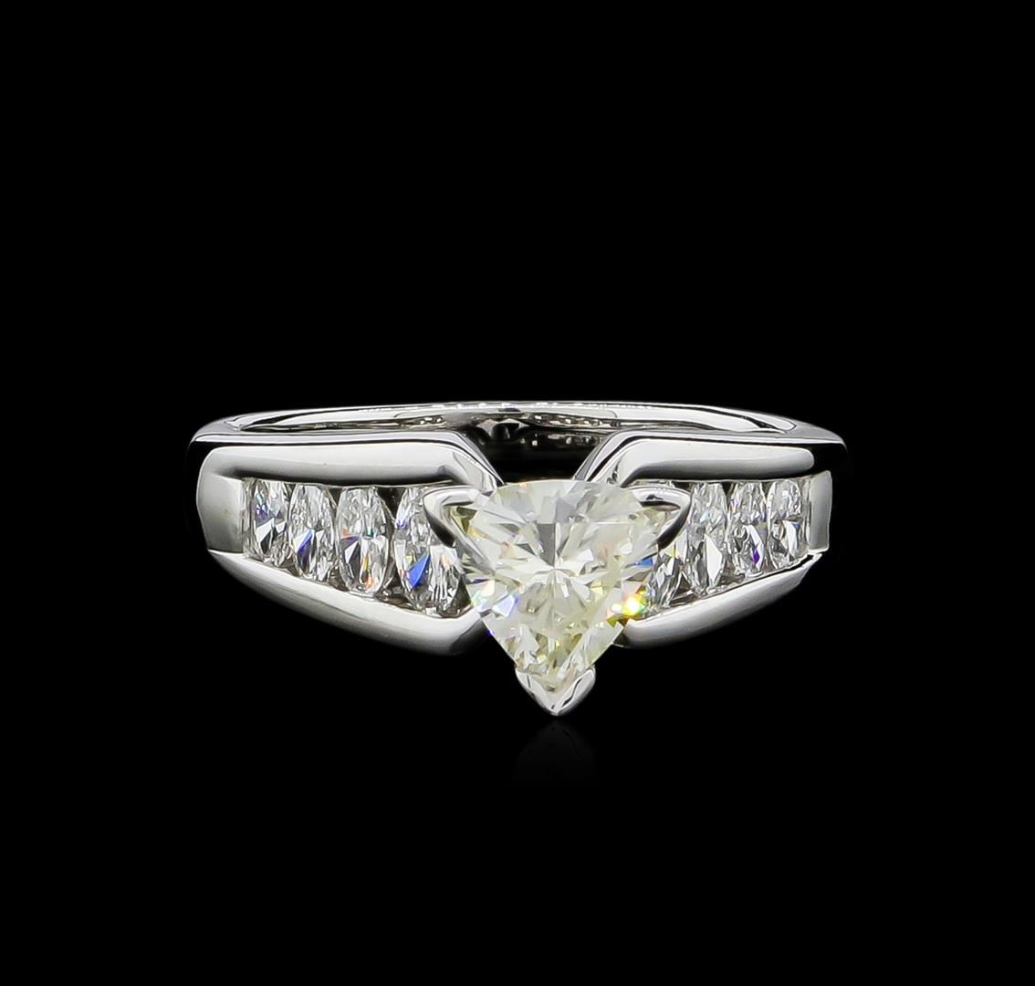 One electronically tested 14KT white gold ladies cast diamond unity ring with a bright polish finish. The featured diamond is supported by tapering diamond set shoulders, completed by a two millimeter wide band. Identified with markings of "14K". Condition is new, good workmanship. Containing: One prong set triangle brilliant cut diamond, measuring 7.20 x 7.18 x 3.70mm (depth est.) approximate weight of 1.19ct with a medium blue fluorescence. Diamond Grading Report attached. Graded in the setting. Clarity: SI-1. Color: J. Depth 51.5%. Table 57.1%. Two channel set marquise shaped cut diamonds, measuring 5.00 x 2.70 x 1.70mm (depth est.) approximate total weight of 2 Stones = 0.30ct. Graded in the setting. Clarity: SI-1 to SI-2. Color: G Two channel set marquise shaped cut diamonds, measuring 4.40 x 2.20 x 1.39mm (depth est.) approximate total weight of 2 Stones = 0.20ct. Graded in the setting. Clarity: SI-2. Color: G Two channel set marquise shaped cut diamonds, measuring 3.90 x 2.10 x 1.32mm (depth est.) approximate total weight of 2 Stones = 0.16ct. Graded in the setting. Clarity: SI-1 to SI-2. Color: G - H Two channel set marquise shaped cut diamonds, measuring 3.50 x 2.10 x 1.32mm (depth est.) approximate total weight of 2 Stones = 0.15ct. Graded in the setting. Clarity: SI-1 to SI-2. Color: G - H. Total Weight of Diamonds 2.00ct. Total Weight of Ring 6.32gm. AIG Appraised at $19,090.00.
