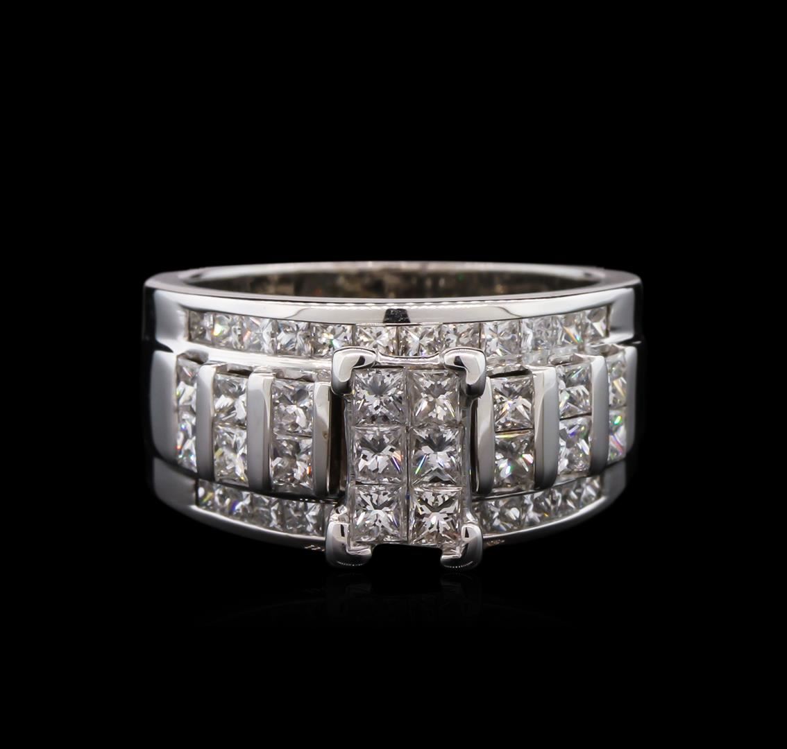 One electronically tested 14KT white gold lady's combination cast & assembled fashion ring with a bright polish finish. The featured lady's ring has a shank measuring 6.99 millimeters wide. Identified with markings of "14K". Condition is new, good workmanship. Containing: Twelve channel set princess cut diamonds, measuring 2.35 x 2.30 x 1.70mm (depth est.) approximate total weight of 12 Stones = 0.90ct. Graded in the setting. Clarity: VS-2 to SI-1. Color: H - I. Cut Good Twenty-Four channel set princess cut diamonds, measuring 1.80 x 1.60 x 1.15mm (depth est.) approximate total weight of 24 Stones = 0.64ct. Graded in the setting. Clarity: VS-2 to SI-1. Color: H - I. Cut Good Six invisible set princess cut diamonds, measuring 2.35 x 2.30 x 1.73mm (depth est.) approximate total weight of 6 Stones = 0.46ct. Graded in the setting. Clarity: VS-2 to SI-1. Color: H - I. Cut Good. Total Weight of Diamonds 2.00ct. Total Weight of Ring 12.00gm. GAS Appraised at $5,620.00.