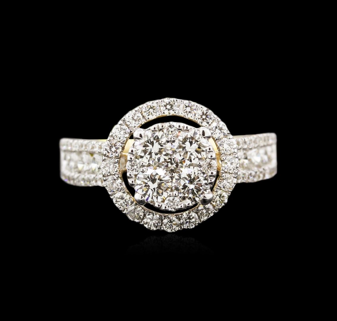 One electronically tested 14KT yellow gold lady's combination cast & assembled wedding ring with a bright polish finish. The featured wedding ring has a halo motif with a 2.4mm shank. Identified with markings of "14K". Condition is new, good workmanship. Containing: Four prong set round brilliant cut diamonds, measuring 3.80 - 3.75 x 2.27mm (depth est.) approximate total weight of 4 Stones = 0.80ct. Graded in the setting. Clarity VS-2 to SI-1 Color I - Good Eleven channel set round brilliant cut diamonds, measuring 2.50 - 2.40 x 1.47mm (depth est.) approximate total weight of 11 Stones = 0.64ct. Graded in the setting. Clarity SI-1 to I-1 Color H - I. Cut Good Twenty prong set round brilliant cut diamonds, measuring 1.60 - 1.50 x 0.93mm (depth est.) approximate total weight of 20 Stones = 0.31ct. Graded in the setting. Clarity SI-1 to I-1 Color H - Good Forty-Four split prong set round brilliant cut diamonds, measuring 1.20 - 1.10 x 0.69mm (depth est.) approximate total weight of 44 Stones = 0.25ct. Graded in the setting. Clarity SI-1 to I-1 Color H - I. Cut Good Total Weight of Diamonds 2.00ct. Total Weight of Ring 4.10gm GAS Appraised at $8,990.00.