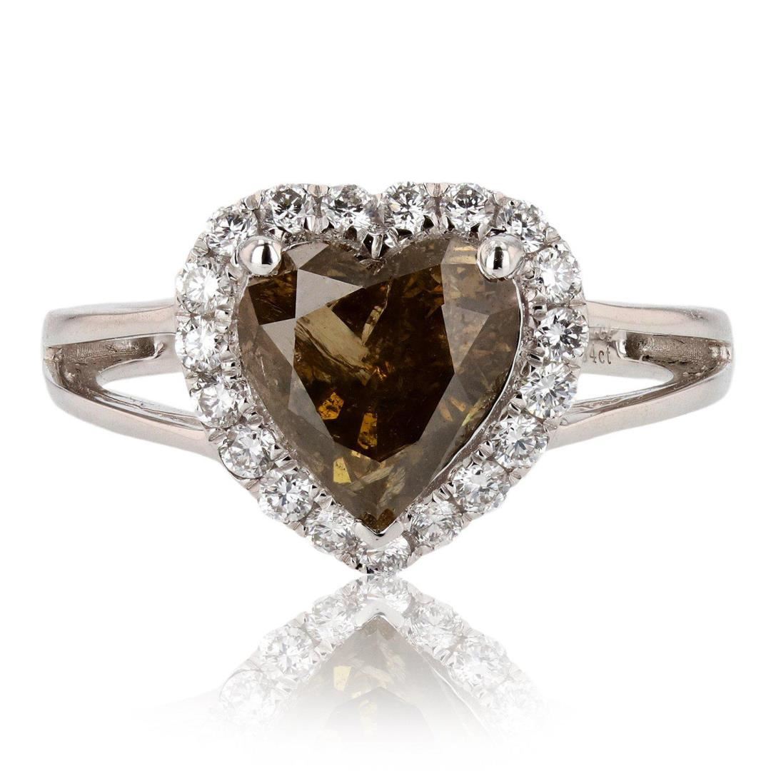 One electronically tested platinum ladies cast diamond ring with a bright polish finish. Condition is new, good workmanship. The featured diamond is set within a diamond bezel supported by split shoulders, completed by a two millimeter wide band. Trademark is Orianne. Identified with markings of "950". Containing: One prong set heart shaped cut diamond, measuring 8.50mm x 8.30mm x 4.60mm (depth est.) approximate weight of 2.01ct. Graded in the setting. Clarity I2 Color Fancy Yellowish Brown Depth 55.4% Table 54.2% Polish Very Good Symmetry Good. Nineteen prong set round brilliant cut diamonds approximate total weight of 19 Stones = 0.34ct. Graded in the setting. Clarity VS1 to VS2 Color D - E Total Weight of Diamonds 2.01 ct Total Weight of Ring 4.82 gm Size: 7
