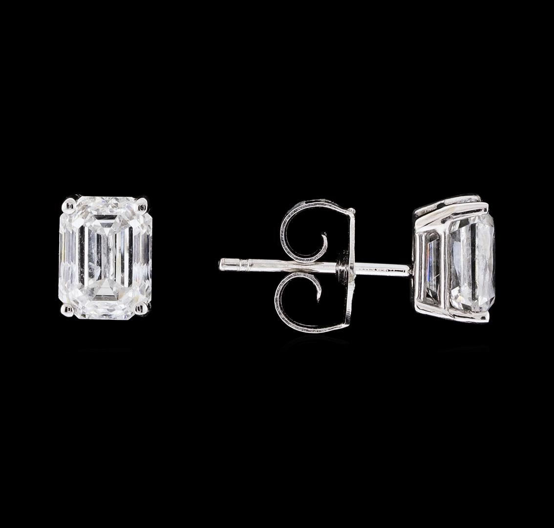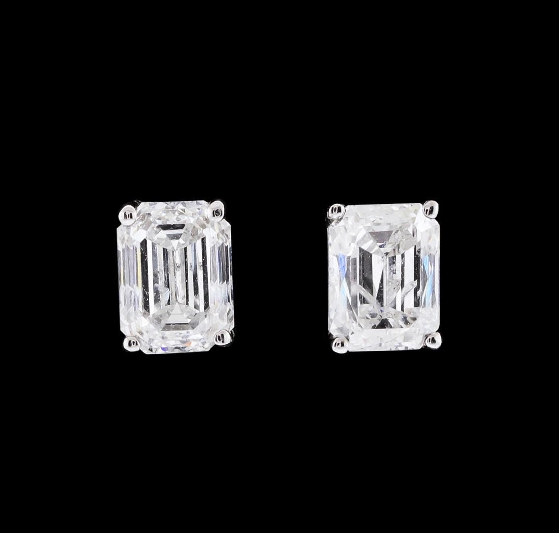 One pair electronically tested 14KT white gold lady's cast stud earrings with friction posts with a basket setting with a bright polish finish. Identified with markings of '14K'. Condition is new, good workmanship. Containing: One prong set emerald cut diamond, measuring 6.40 x 4.80 x 3.45mm (depth est.) , 5.00.%. GTCF approximate weight of 1.04ct. Graded in the setting. Clarity SI-3. Color: G - H Cut Very Good One prong set emerald cut diamond, measuring 6.20 x 4.78 x 3.50mm (depth est.) approximate weight of 0.97ct. Graded in the setting. Clarity I-1. Color: G - H Cut Good. Total Weight of Diamonds 2.01ct.. Total Weight of Earrings 1.50gm. GAS Appraised at $10,605.00.