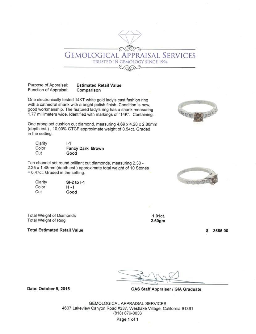 One electronically tested 14KT white gold lady's cast fashion ring with a cathedral shank with a bright polish finish. The featured lady's ring has a shank measuring 1.77 millimeters wide. Identified with markings of "14K". Condition is new, good workmanship. Containing: One prong set cushion cut diamond, measuring 4.69 x 4.28 x 2.80mm (depth est.) , 10.00.%. GTCF approximate weight of 0.54ct. Graded in the setting. Clarity: I-1 Cut Good Ten channel set round brilliant cut diamonds, measuring 2.30 - 2.25 x 1.48mm (depth est.) approximate total weight of 10 Stones = 0.47ct. Graded in the setting. Clarity: SI-2 to I-1. Color: H - I. Cut Good. Total Weight of Diamonds 1.01ct. Total Weight of Ring 2.60gm. GAS Appraised at $3,665.00.