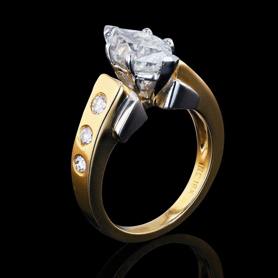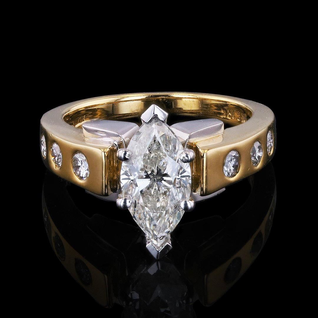One polished, stamped, and tested 18K yellow and white gold ring mounted with: I genuine diamond center stone weighing 2.01 carat, and 6 genuine round diamonds weighing 0.25 carats. This item weighs 9.0 grams, condition is new, excellent workmanship. MAIN GEMSTONE EGL Report No.: EGL3410154927 Identity: Natural Diamond Shape: Marquise Cutting Style: Brilliant Cut Measurements: 11.31mm x 5.90mm x 4.57mm Weight: 2.01 carat Color Grade: H Clarity Grade: SI2 Polish: Good Symmetry: Very Good Refractive Index: 2.417 Hardness: 10 ADJACENT GEMSTONES ON RING Identity: Natural Diamond Shape: Round Cutting Style: Brilliant Cut Quantity: 6 Diamonds Measurements: 2.0mm to 2.7mm Total Weight: 0.25 carats Color Grade: H Clarity Grade: SI1 to SI2 Refractive Index: 2.418 Hardness: 10 CENTER DIAMOND WEIGHT: 2.01 ct TOTAL DIAMOND WEIGHT: 2.26 cts WEIGHT OF ITEM: 9.0 grams GOLD CONTENT: 18K Yellow an White Gold