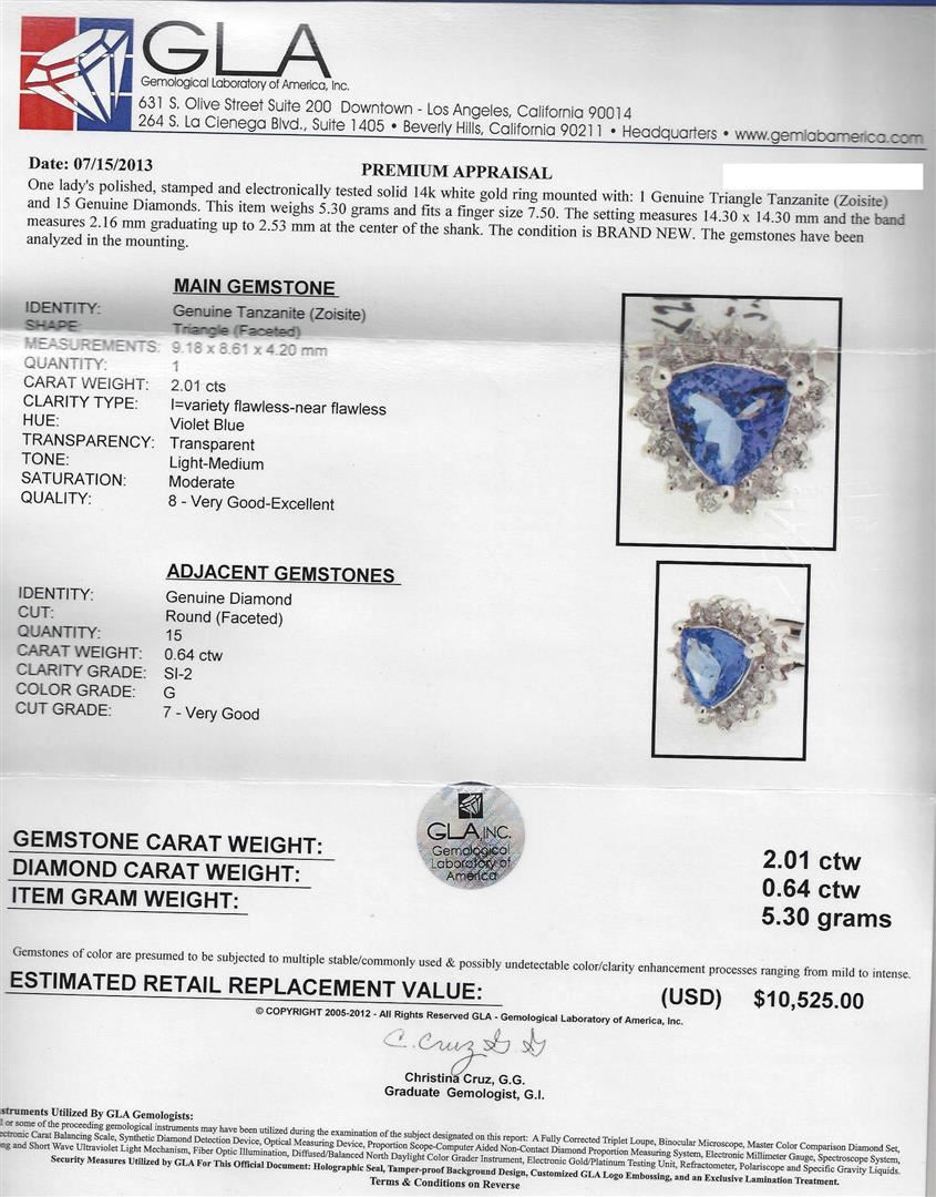 One lady's polished, stamped and electronically tested solid 14k white gold ring mounted with: 1 Genuine Triangle Tanzanite (Zoisite) and 15 Genuine Diamonds. This item weighs 5.30 grams and fits a finger size 7.50. the setting measures 14.30 x 14.30 mm and the band measures 2.16 mm graduated up to 2.53 mm at the center of the shank. The condition is Brand New. The gemstones have been analyzed in the mounting. Main Gemstone: Identity: Genuine Tanzanite (Zoisite). Shape: Triangle (Faceted). Measurements: 9.17 x 8.61 x 4.20 mm. Quantity: 1. Carat Weight: 2.01cts. Clarity Type: 1=variety flawless-near flawless. Hue: Violet Blue. Transparency: Transparent. Tone: Light-Medium. Saturation: Moderate. Quality: 8-Very Good Excellent. Adjacent Gemstones: Identity: Genuine Diamond. Cut: Round (Faceted). Quantity: 15. Carat Weight: 0.64ctw. Clarity Grade: SI-2. Color Grade: G. Cut Grade: 7-Very Good. Gemstone Carat Weight: 2.01ctw. Diamond Carat Weight: 0.64ctw. Item Gram Weight: 5.30 grams. GLA Appraised at $10,525.00.