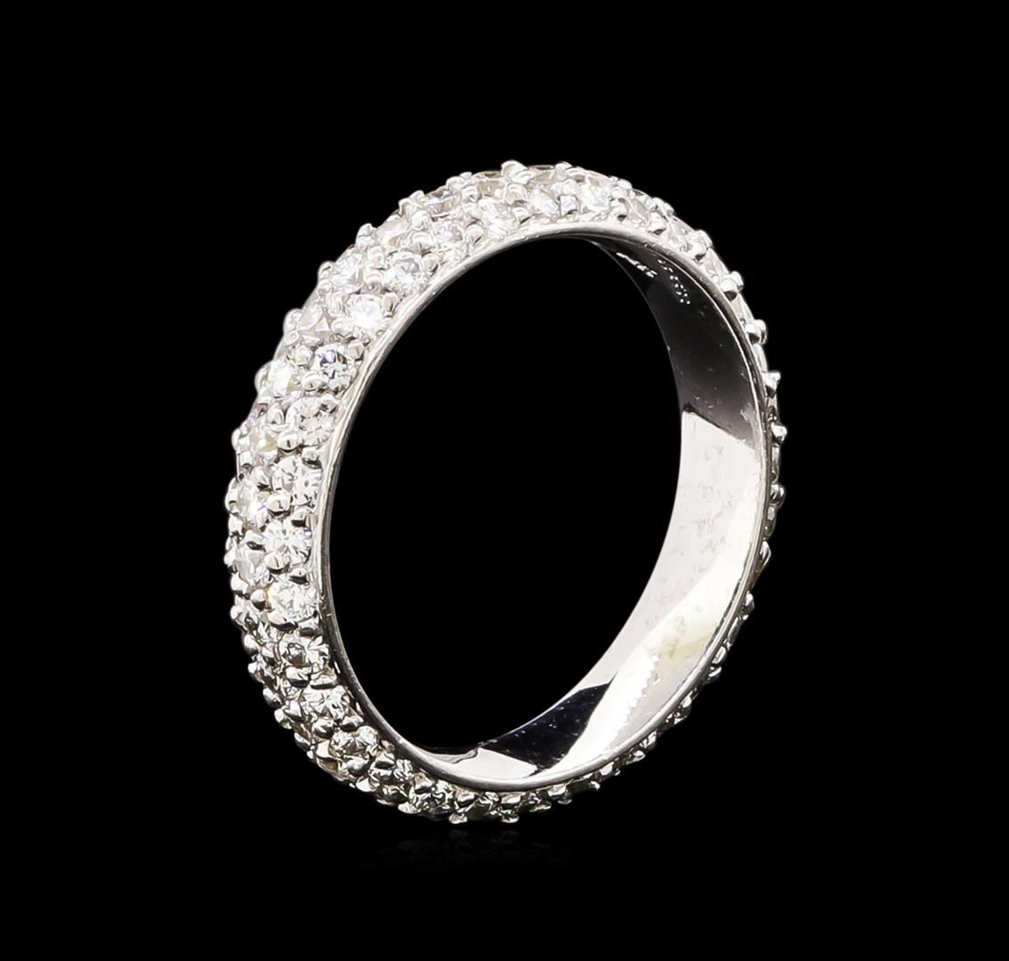 One electronically tested 14KT white gold cast diamond eternity ring with a bright polish finish. The eternity ring features three ribbons of diamonds set in a four millimeter wide band. The ring is a size seven and three-quarters. Identified with markings of "14K". Condition is new, good workmanship. Containing: Thirty-Two prong set round brilliant cut diamonds, measuring 1.90 - 1.90 x 1.14mm (depth est.) approximate total weight of 32 Stones = 0.90ct. Graded in the setting. Clarity: VS-1 to SI-1. Color: G - I Sixty-Four prong set round brilliant cut diamonds, measuring 1.70 - 1.60 x 0.99mm (depth est.) approximate total weight of 64 Stones = 1.11ct. Graded in the setting. Clarity: VS-1 to SI-1. Color: G - H. Total Weight of Diamonds 2.01ct. Total Weight of Ring 3.97gm. AIG Appraised at $7,535.00.