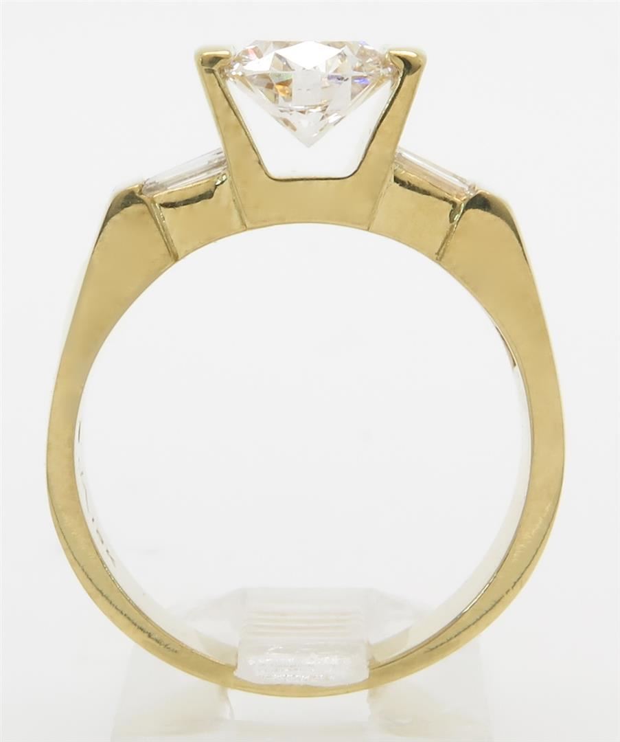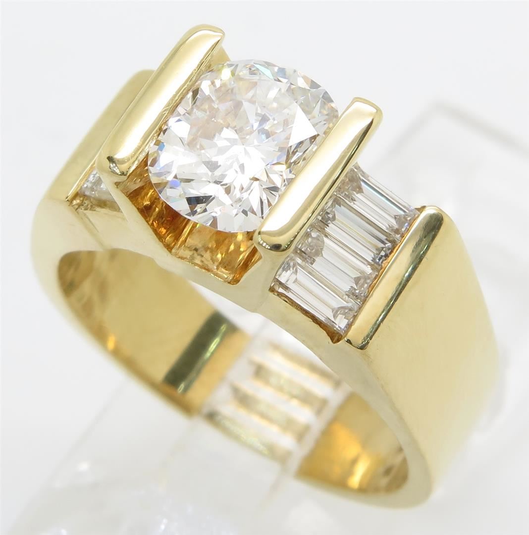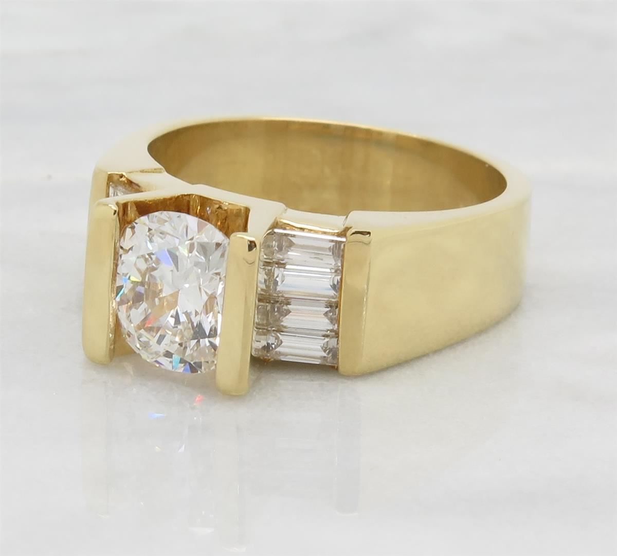 One tested 18K yellow gold diamond ring. Condition is new. Containing: One Oval cut Diamond. Weight: 1.49CT, Clarity: SI1, Color: G-H. Eight additional Baguette Cut Diamonds. Approximate total diamond weight: 2.01CTW. Diamonds are graded in the mounting, unless otherwise stated. Weight of ring: 9.7 grams. Size:7.0