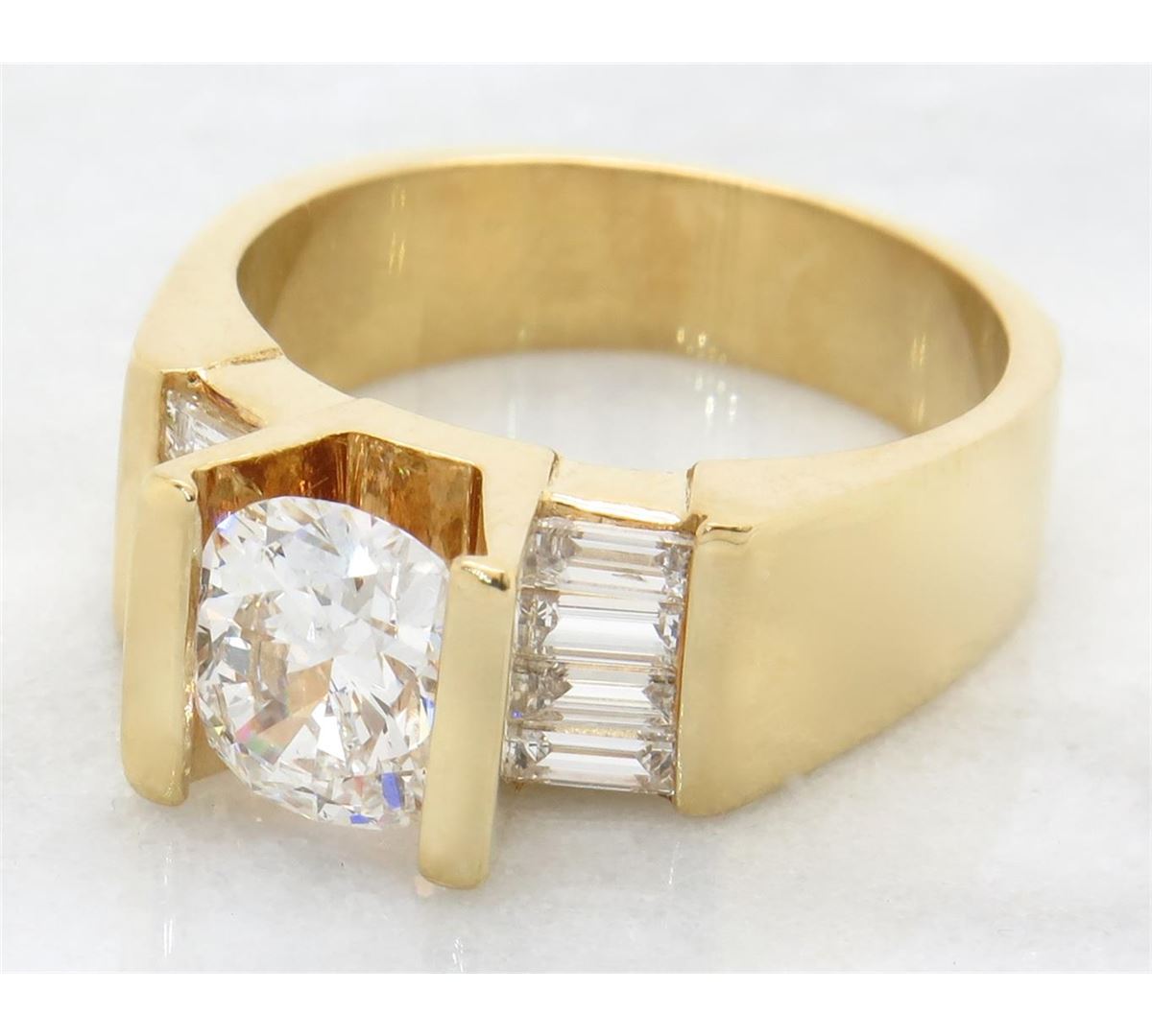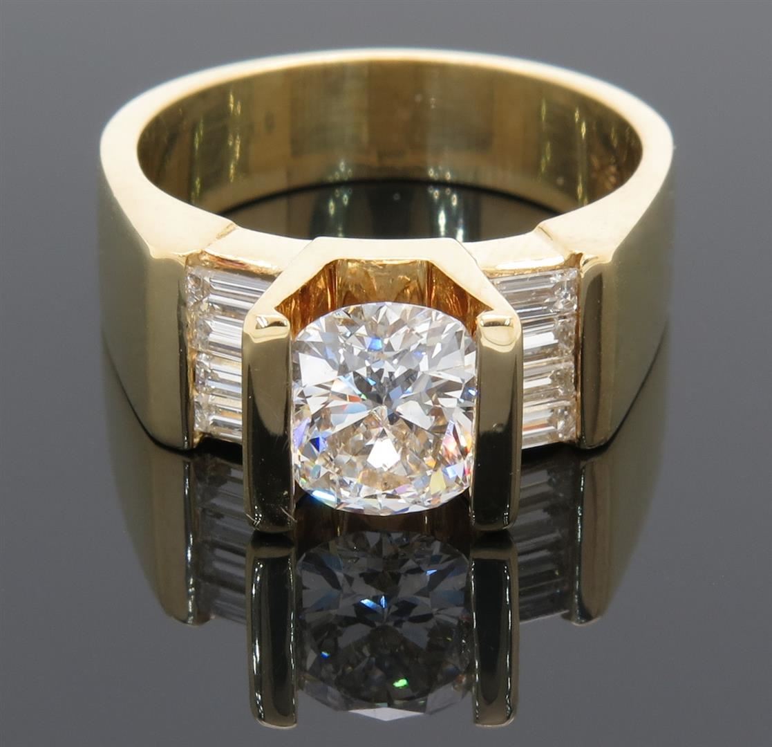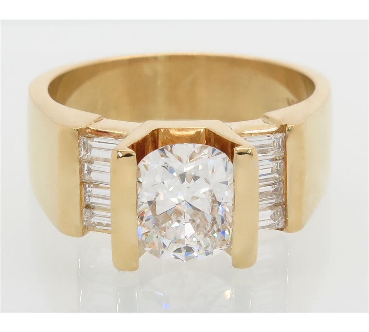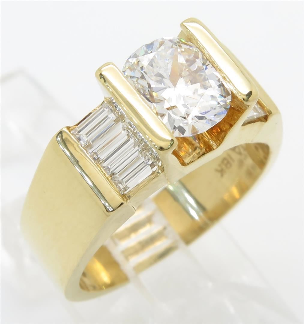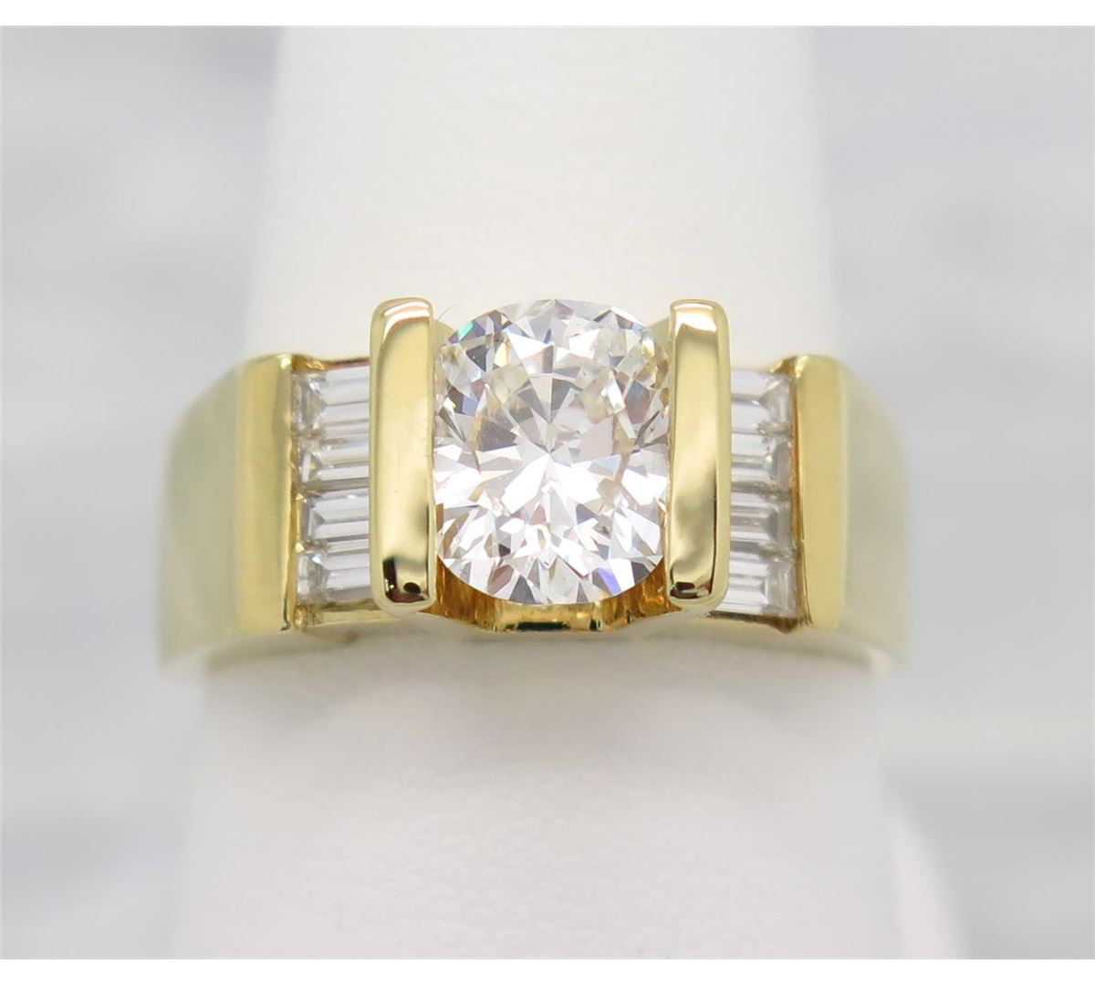 One tested 18K yellow gold diamond ring. Condition is new. Containing: One Oval cut Diamond. Weight: 1.49CT, Clarity: SI1, Color: G-H. Eight additional Baguette Cut Diamonds. Approximate total diamond weight: 2.01CTW. Diamonds are graded in the mounting, unless otherwise stated. Weight of ring: 9.7 grams. Size:7.0