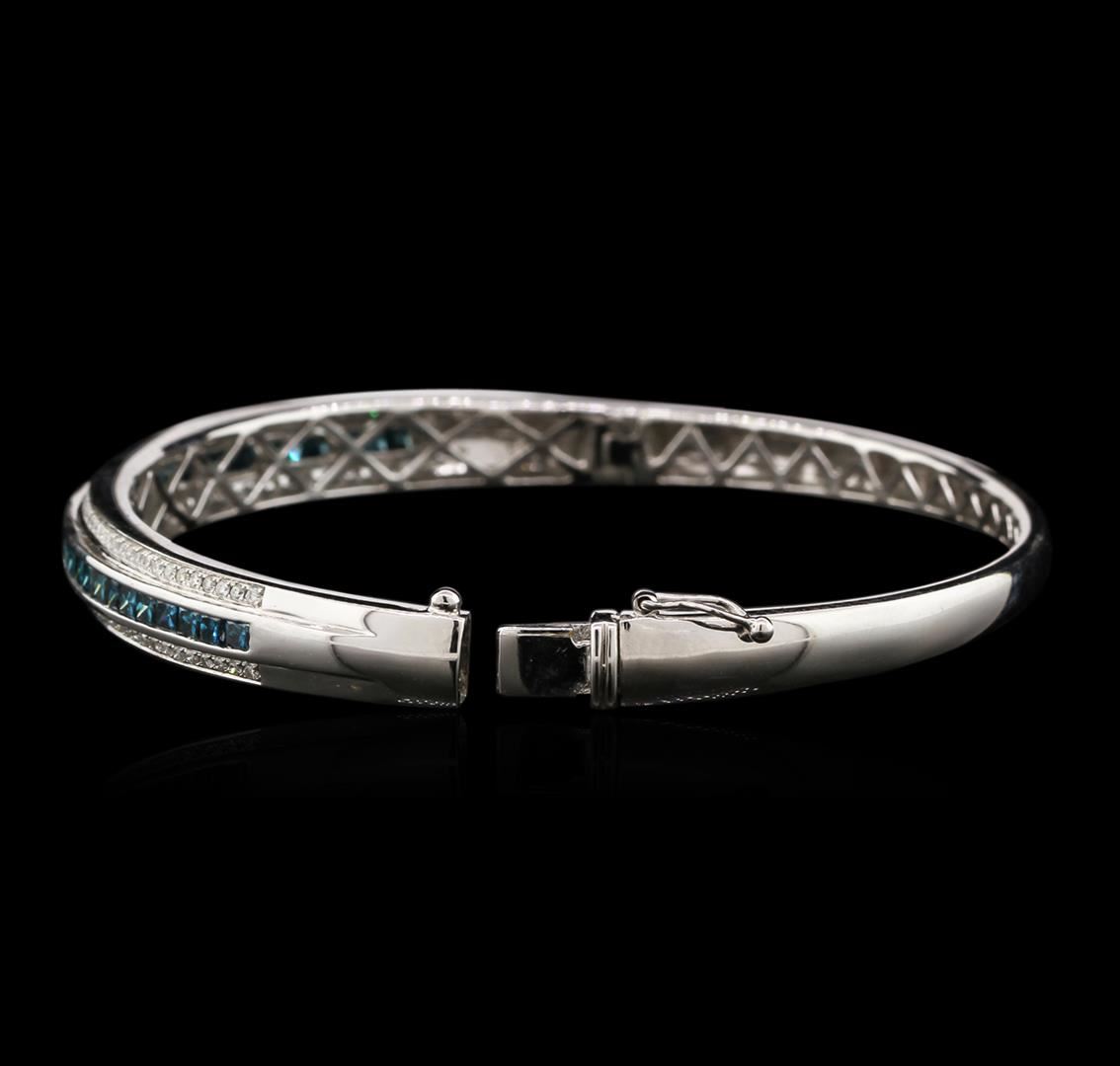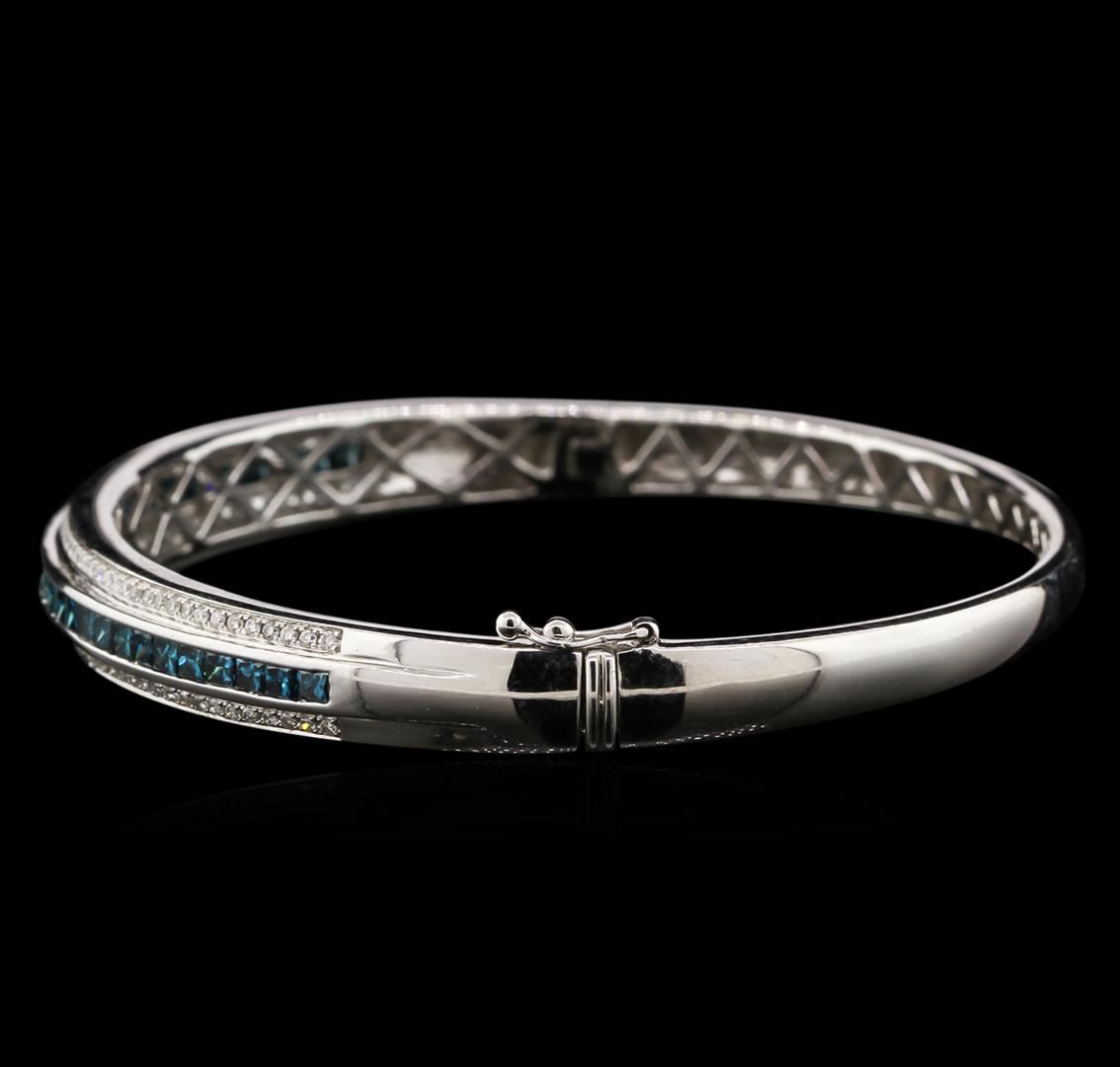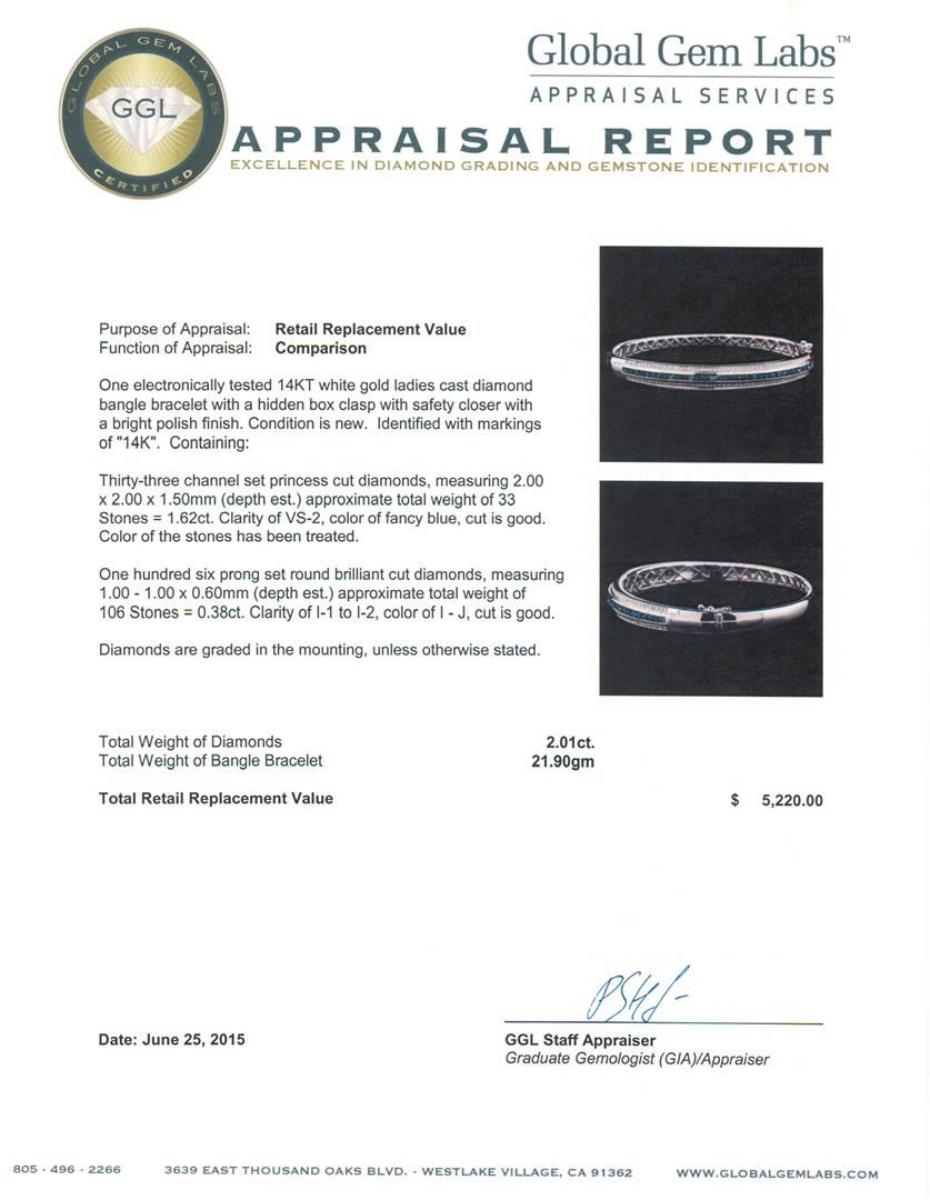 One electronically tested 14KT white gold ladies cast diamond bangle bracelet with a hidden box clasp with safety closer with a bright polish finish. Identified with markings of "14K". Condition is new. Containing: Thirty-Three channel set princess cut diamonds, measuring 2.00 x 2.00 x 1.50mm (depth est.) approximate total weight of 33 Stones = 1.62ct. Clarity: VS-2, Cut is Good. Color of the stones has been treated. One Hundred Six prong set round brilliant cut diamonds, measuring 1.00 - 1.00 x 0.60mm (depth est.) approximate total weight of 106 Stones = 0.38ct. Clarity: I-1 to I-2. Color: I - J, Cut is Good. Diamonds are graded in the mounting, unless otherwise stated. Total Weight of Diamonds 2.01ct. Total Weight of Bangle Bracelet 21.90 grams. GGL Appraised at $5,220.00.