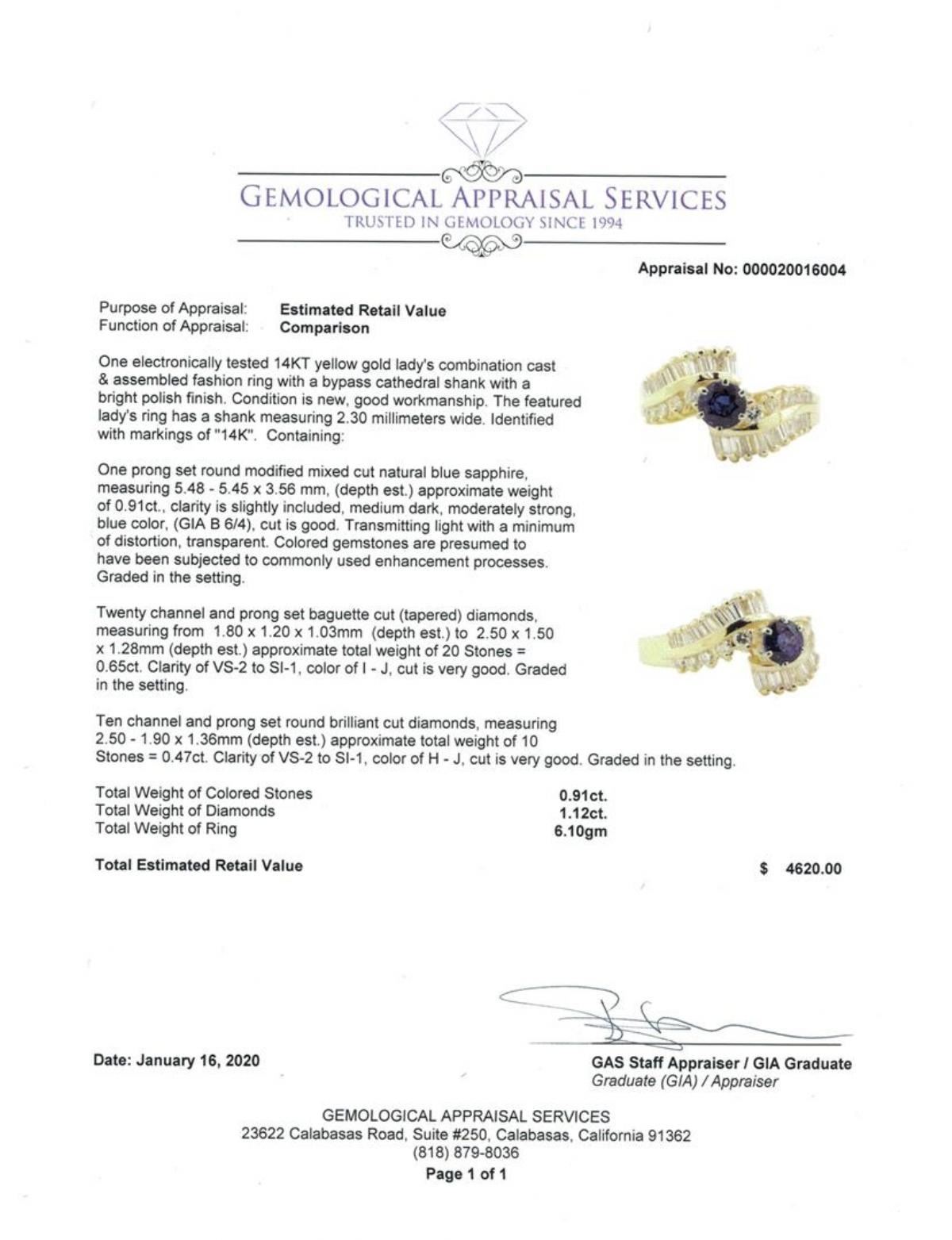 One electronically tested 14KT yellow gold lady's combination cast & assembled fashion ring with a bypass cathedral shank with a bright polish finish. The featured lady's ring has a shank measuring 2.30 millimeters wide. Identified with markings of '14K'. Condition is new, good workmanship. Containing: One prong set round modified mixed cut natural blue sapphire, measuring 5.48 - 5.45 x 3.56 mm, (depth est.) approximate weight of 0.91ct., clarity is slightly included, medium dark, moderately strong, blue color, (GIA B 6/4), cut is good. Transmitting light with a minimum of distortion, transparent. Colored gemstones are presumed to have been subjected to commonly used enhancement processes. Graded in the setting. Twenty channel and prong set baguette cut (tapered) diamonds, measuring from 1.80 x 1.20 x 1.03mm (depth est.) to 2.50 x 1.50 x 1.28mm (depth est.) approximate total weight of 20 Stones = 0.65ct. Graded in the setting. Color I - J Clarity VS-2 to SI-1 Cut Very Good Ten channel and prong set round brilliant cut diamonds, measuring 2.50 - 1.90 x 1.36mm (depth est.) approximate total weight of 10 Stones = 0.47ct. Graded in the setting. Color H - J Clarity VS-2 to SI-1 Cut Very Good. Total Weight of Colored Stones 0.91ct.. Total Weight of Diamonds 1.12ct.. Total Weight of Ring 6.10gm GAS Appraised at $4620.00. GAS Appraised.