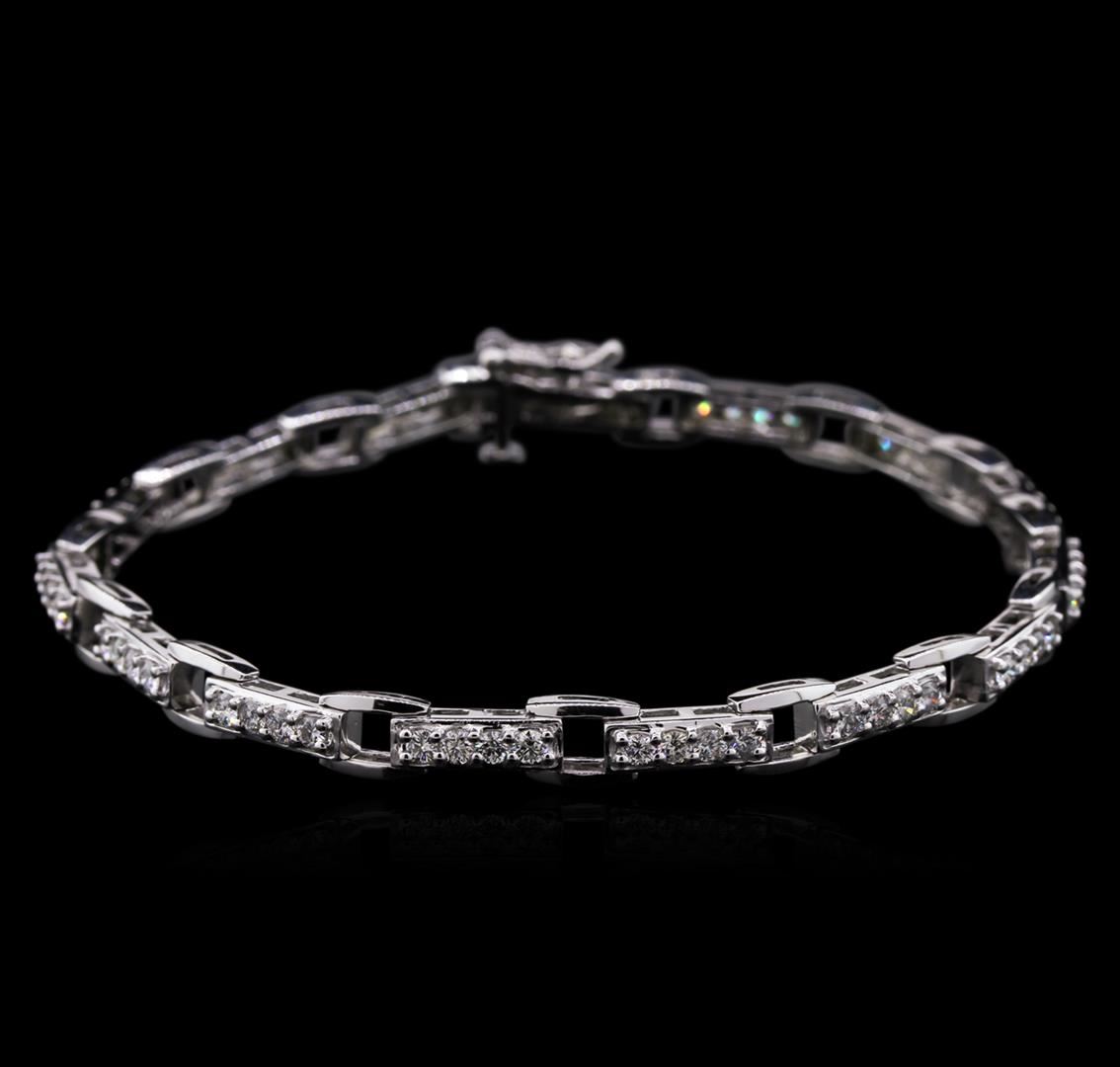 One electronically tested 14KT white gold lady's combination cast & assembled fashion bracelet with a tongue clasp with foldover safety with a bright polish finish. The featured lady's bracelet measures 7.5 inches in length. Identified with markings of "14K". Condition is new, good workmanship. Containing: Sixty prong set round brilliant cut diamonds, measuring 2.10 - 2.05 x 1.29mm (depth est.) approximate total weight of 60 Stones = 2.03ct. Graded in the setting. Clarity: SI-1 to I-1 . Color: H - I. Cut Good. Total Weight of Diamonds 2.03ct.. Total Weight of Bracelet 13.50gm at $ 7010.00 GAS Appraised.