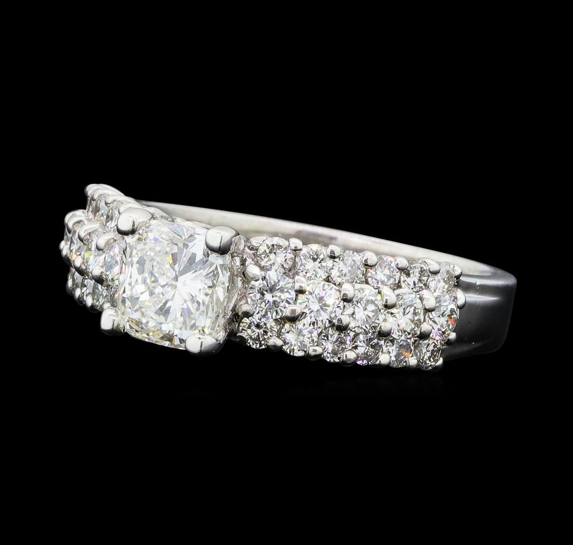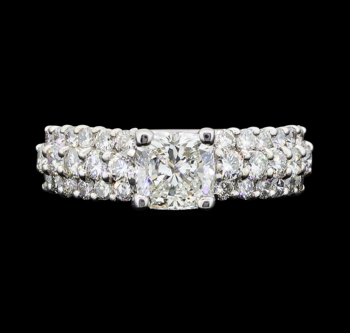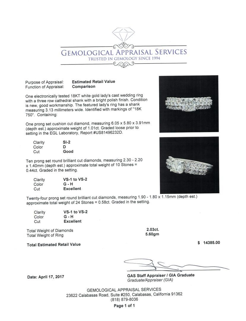 One electronically tested 18KT white gold lady's cast wedding ring with a three row cathedral shank with a bright polish finish. The featured lady's ring has a shank measuring 3.13 millimeters wide. Identified with markings of '18K 750'. Condition is new, good workmanship. Containing: One prong set cushion cut diamond, measuring 6.05 x 5.80 x 3.91mm (depth est.) approximate weight of 1.01ct. Graded loose prior to setting in the EGL Laboratory, Report #US81496232D. Color D Clarity SI-2 Cut Good Ten prong set round brilliant cut diamonds, measuring 2.30 - 2.20 x 1.40mm (depth est.) approximate total weight of 10 Stones = 0.44ct. Graded in the setting. Color G - H Clarity VS-1 to VS-2 Cut Excellent Twenty-Four prong set round brilliant cut diamonds, measuring 1.90 - 1.80 x 1.15mm (depth est.) approximate total weight of 24 Stones = 0.58ct. Graded in the setting. Color G - H Clarity VS-1 to VS-2 Cut Excellent. Total Weight of Diamonds 2.03ct.. Total Weight of Ring 5.60gm GAS Appraised at $14385.00. GAS Appraised at $14,385.00.