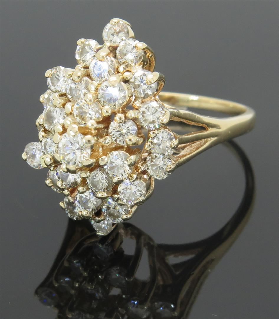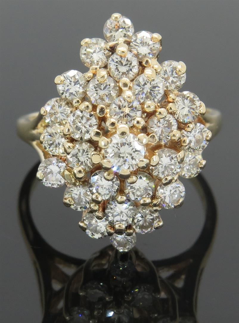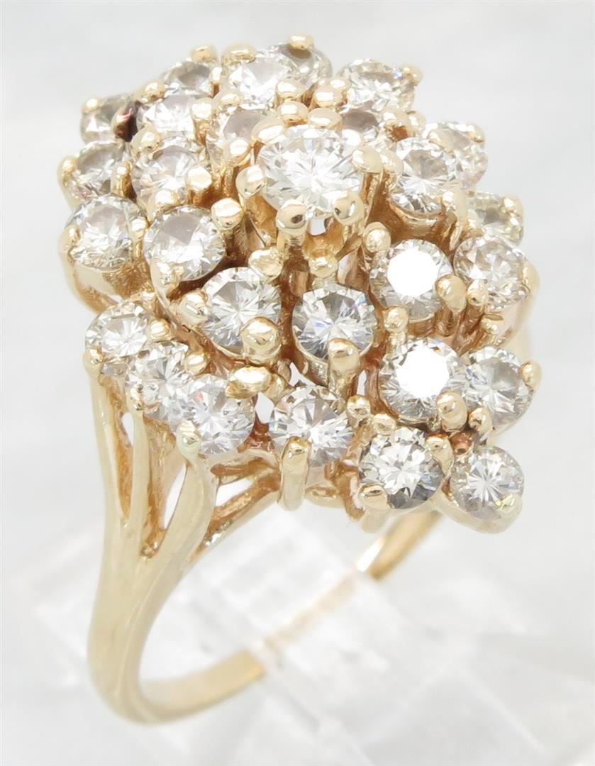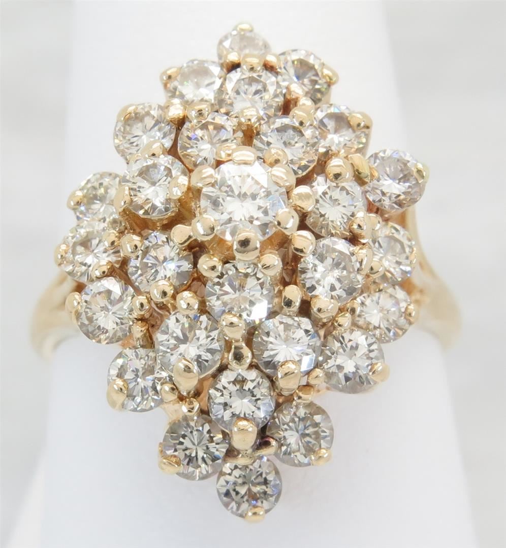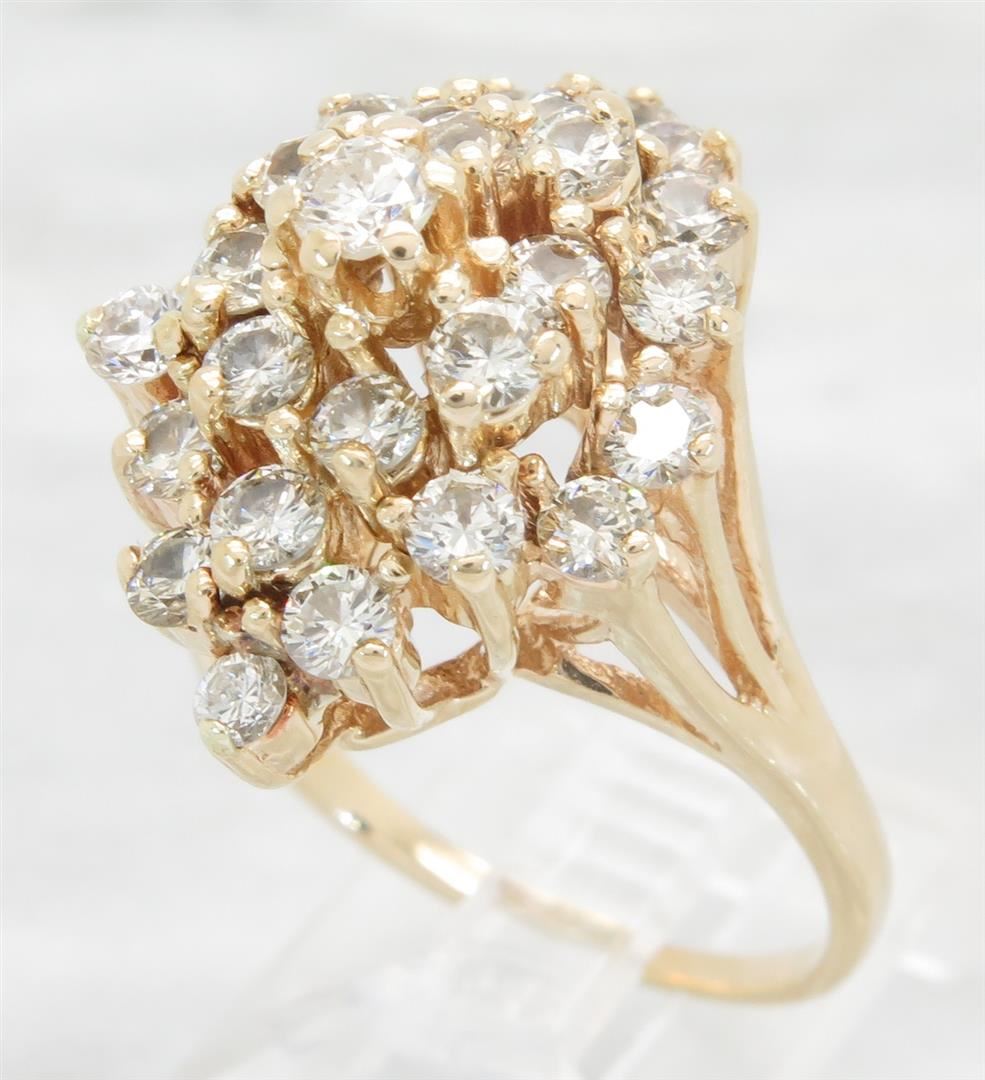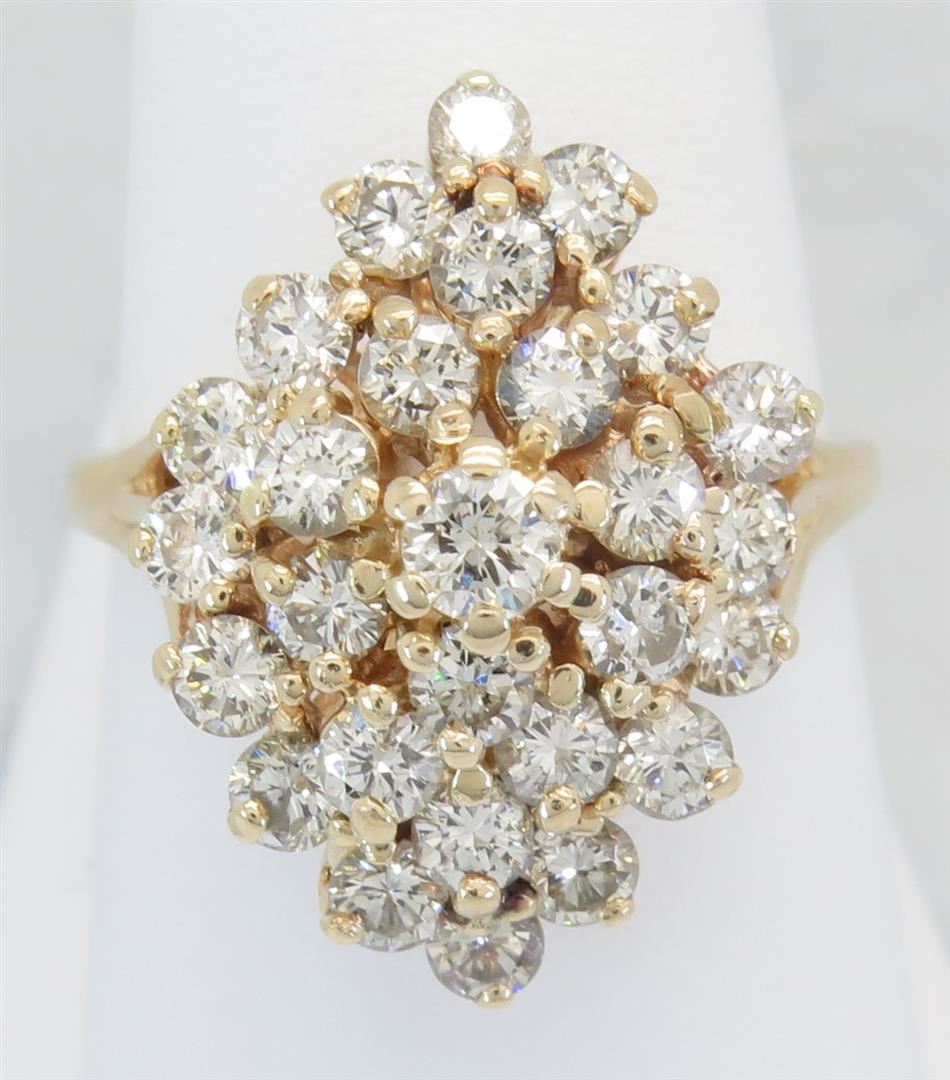 One tested 14K yellow gold diamond ring. Containing: 28 Round Brilliant Cut Diamonds. Clarity: I-SI, Color: G-I. Approximate total diamond weight: 2.03CTW. Diamonds are graded in the mounting, unless otherwise stated. Weight: 8.2 grams. Size: 7.5.