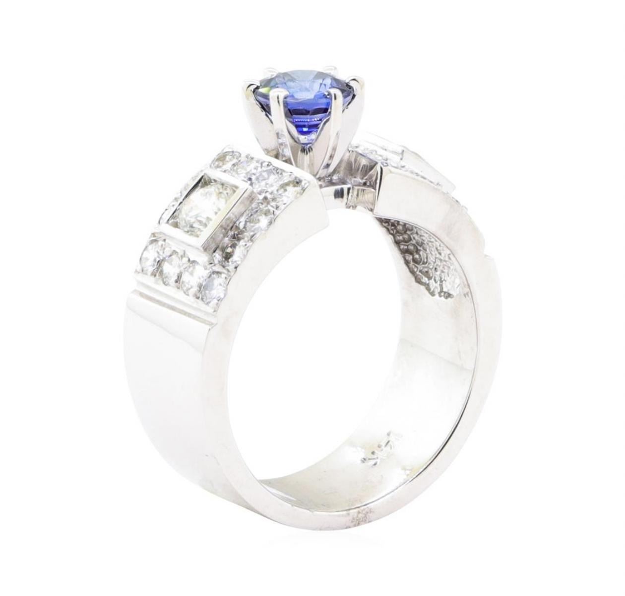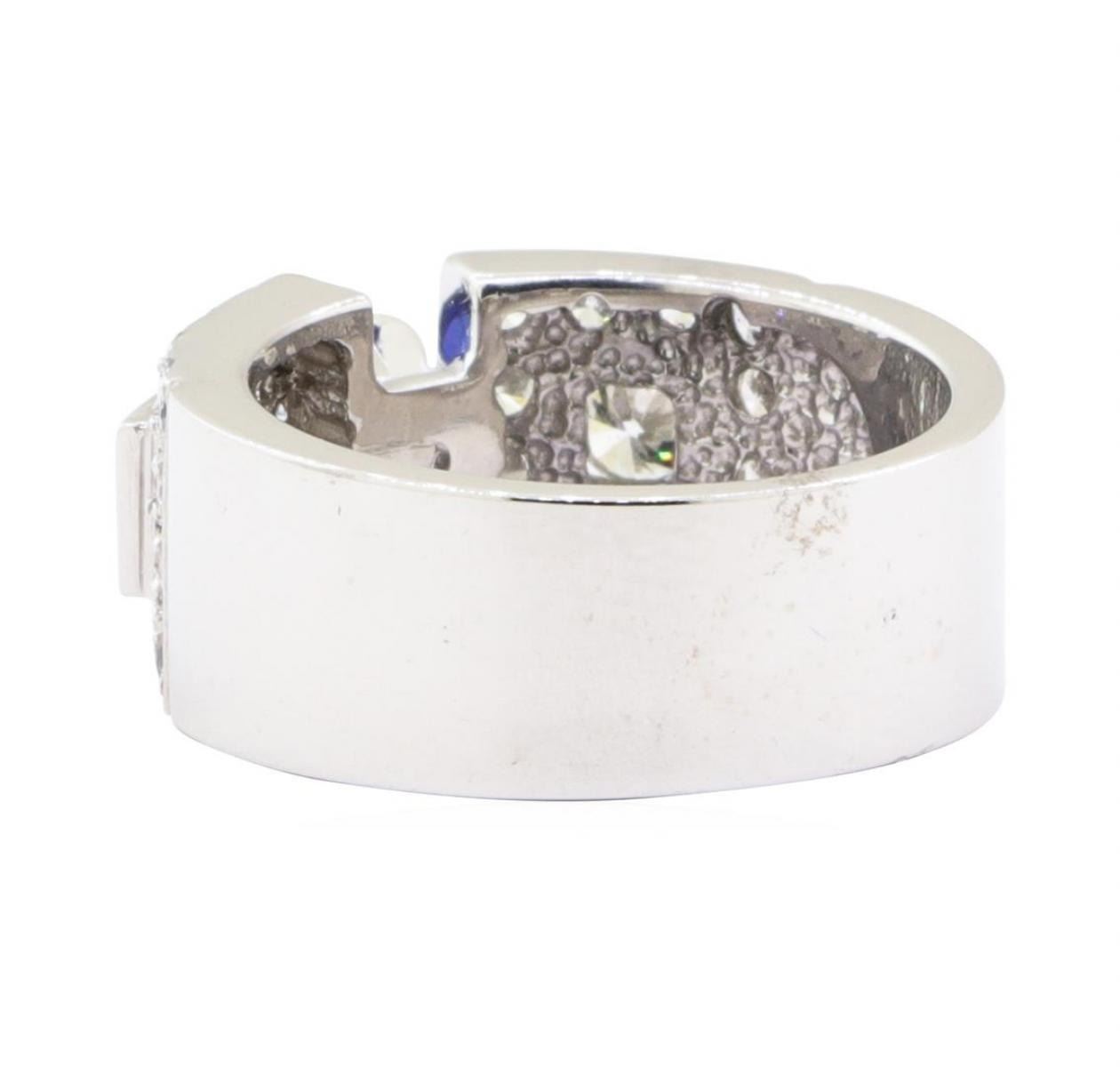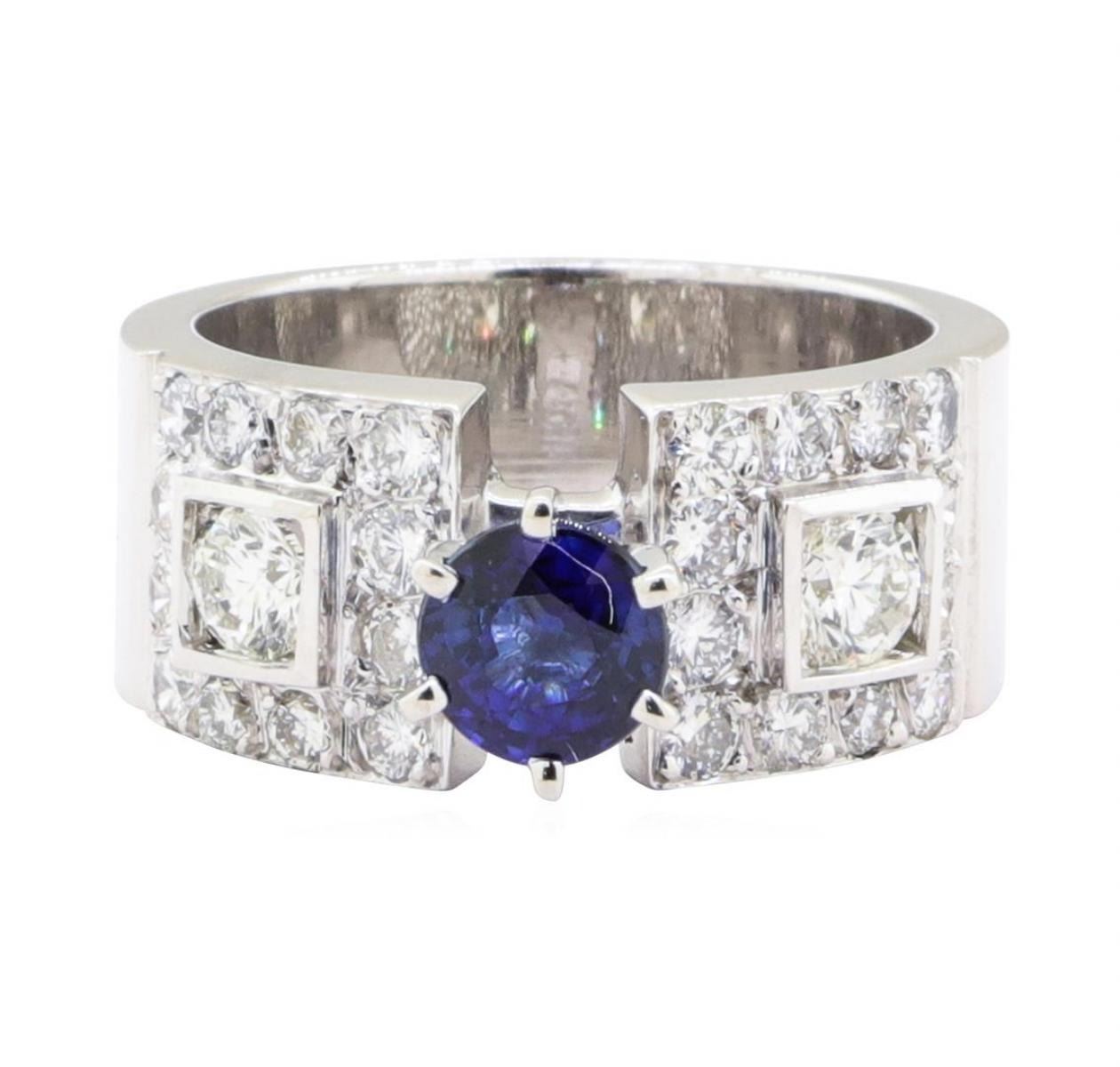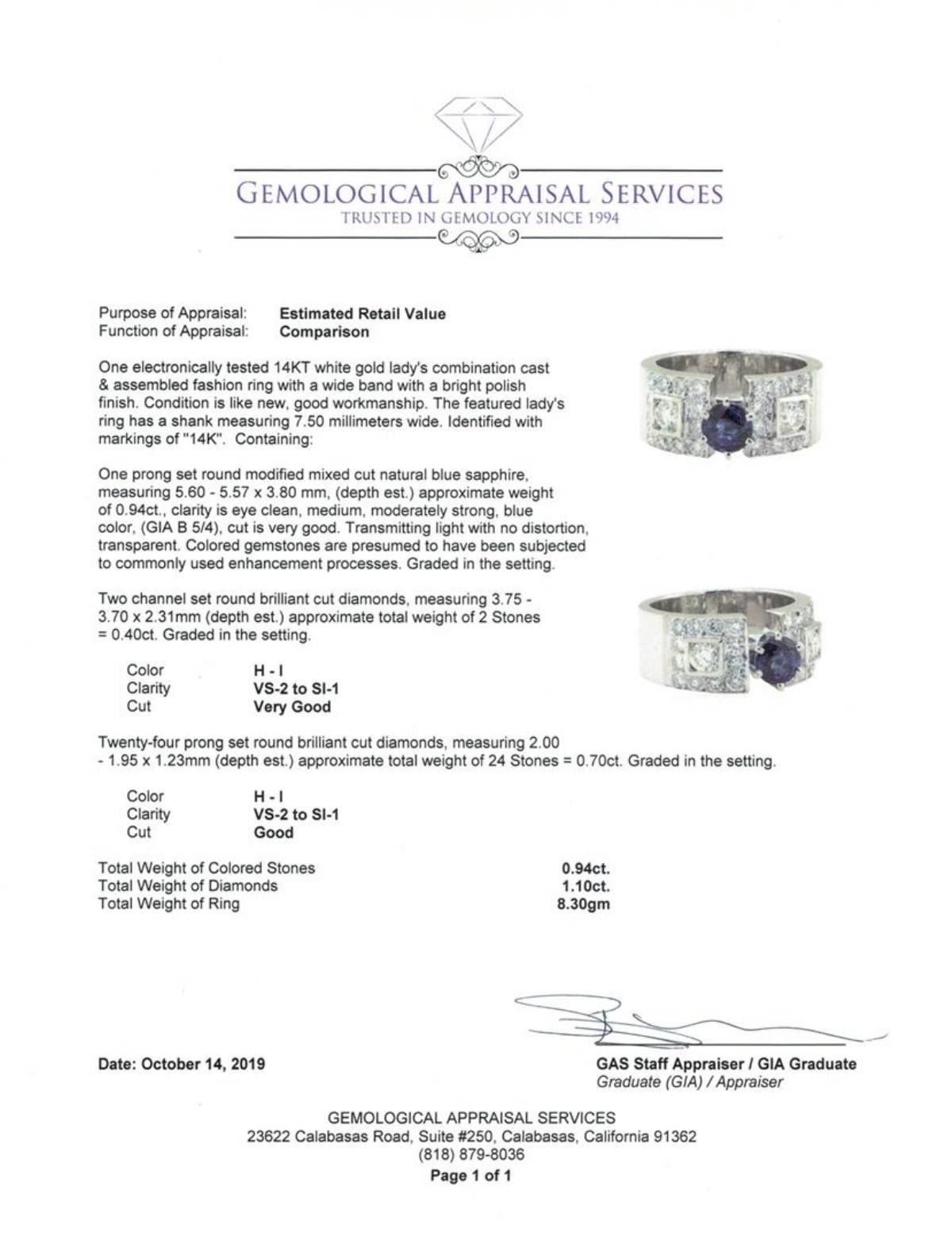 One electronically tested 14KT white gold lady's combination cast & assembled fashion ring with a wide band with a bright polish finish. The featured lady's ring has a shank measuring 7.50 millimeters wide. Identified with markings of '14K'. Condition is Good. Containing: One prong set round modified mixed cut natural blue sapphire, measuring 5.60 - 5.57 x 3.80 mm, (depth est.) approximate weight of 0.94ct., clarity is eye clean, medium, moderately strong, blue color, (GIA B 5/4), cut is very good. Transmitting light with no distortion, transparent. Colored gemstones are presumed to have been subjected to commonly used enhancement processes. Graded in the setting. Two channel set round brilliant cut diamonds, measuring 3.75 - 3.70 x 2.31mm (depth est.) approximate total weight of 2 Stones = 0.40 ct. Graded in the setting. Color H - I Clarity VS-2 to SI-1 Cut Very Good Twenty-Four prong set round brilliant cut diamonds, measuring 2.00 - 1.95 x 1.23mm (depth est.) approximate total weight of 24 Stones = 0.70 ct. Graded in the setting. Color H - I Clarity VS-2 to SI-1 Cut Good. Total Weight of Colored Stones 0.94ct.. Total Weight of Diamonds 1.10 ct.. Total Weight of Ring 8.30gm GAS Appraised at $5340.00. GAS Appraised.