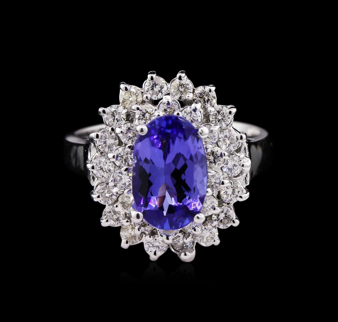 One electronically tested 14KT white gold lady's cast fashion ring with a double basket halo with a bright polish finish. The featured lady's ring has a shank measuring 2.64 millimeters wide. Identified with markings of "14K". Condition is new, good workmanship. Containing: One prong set oval modified brilliant cut natural tanzanite, measuring 9.92 x 6.50 x 4.10mm, 10% bulge factor, approximate weight of 2.04ct., clarity is eye clean, type I, medium, very slightly grayish, bluish violet color, (GIA bV 5/3), cut is good. Transmitting light with no distortion, transparent. Colored gemstones are presumed to have been subjected to commonly used enhancement processes. Naturally occurring external characteristics are present. Graded in the setting. Eighteen prong set round brilliant cut diamonds, measuring 2.00 - 1.90 x 1.25mm (depth est.) approximate total weight of 18 Stones = 0.52ct. Graded in the setting. Clarity: SI-1 to I-1. Color: H - Good Fourteen prong set round brilliant cut diamonds, measuring 1.90 - 1.80 x 1.13mm (depth est.) approximate total weight of 14 Stones = 0.33ct. Graded in the setting. Clarity: SI-1 to I-1. Color: H - Good. Total Weight of Colored Stones 2.04ct. Total Weight of Diamonds 0.85ct. Total Weight of Ring 5.40gm. GAS Appraised at $5,040.00.