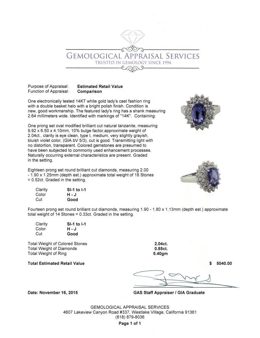 One electronically tested 14KT white gold lady's cast fashion ring with a double basket halo with a bright polish finish. The featured lady's ring has a shank measuring 2.64 millimeters wide. Identified with markings of "14K". Condition is new, good workmanship. Containing: One prong set oval modified brilliant cut natural tanzanite, measuring 9.92 x 6.50 x 4.10mm, 10% bulge factor, approximate weight of 2.04ct., clarity is eye clean, type I, medium, very slightly grayish, bluish violet color, (GIA bV 5/3), cut is good. Transmitting light with no distortion, transparent. Colored gemstones are presumed to have been subjected to commonly used enhancement processes. Naturally occurring external characteristics are present. Graded in the setting. Eighteen prong set round brilliant cut diamonds, measuring 2.00 - 1.90 x 1.25mm (depth est.) approximate total weight of 18 Stones = 0.52ct. Graded in the setting. Clarity: SI-1 to I-1. Color: H - Good Fourteen prong set round brilliant cut diamonds, measuring 1.90 - 1.80 x 1.13mm (depth est.) approximate total weight of 14 Stones = 0.33ct. Graded in the setting. Clarity: SI-1 to I-1. Color: H - Good. Total Weight of Colored Stones 2.04ct. Total Weight of Diamonds 0.85ct. Total Weight of Ring 5.40gm. GAS Appraised at $5,040.00.