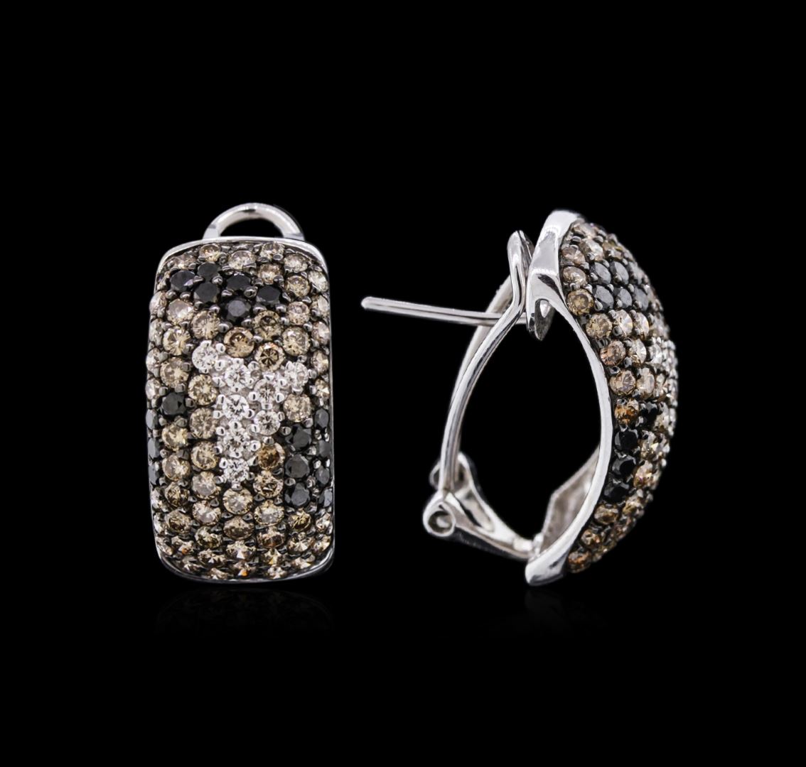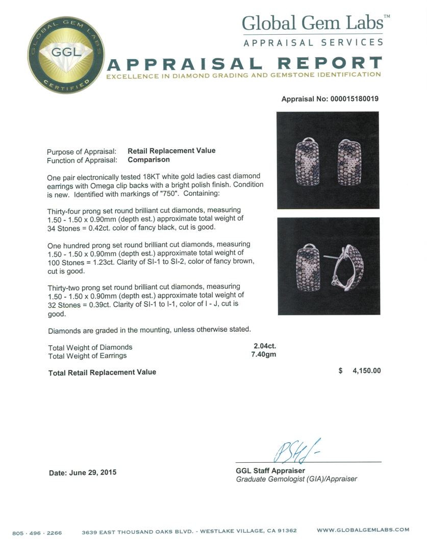 One pair electronically tested 18KT white gold ladies cast diamond earrings with Omega clip backs with a bright polish finish. Identified with markings of "750". Condition is new. Containing: Thirty-Four prong set round brilliant cut diamonds, measuring 1.50 - 1.50 x 0.90mm (depth est.) approximate total weight of 34 Stones = 0.42ct. color of fancy black, cut is Good. One Hundred prong set round brilliant cut diamonds, measuring 1.50 - 1.50 x 0.90mm (depth est.) approximate total weight of 100 Stones = 1.23ct. Clarity: SI-1 to SI-2, color of fancy brown, cut is good. Thirty-Two prong set round brilliant cut diamonds, measuring 1.50 - 1.50 x 0.90mm (depth est.) approximate total weight of 32 Stones = 0.39ct. Clarity: SI-1 to I-1. Color: I - J, Cut is Good. Diamonds are graded in the mounting, unless otherwise stated. Total Weight of Diamonds 2.04ct. Total Weight of Earrings 7.40 grams. GGL Appraised at $4,150.00.