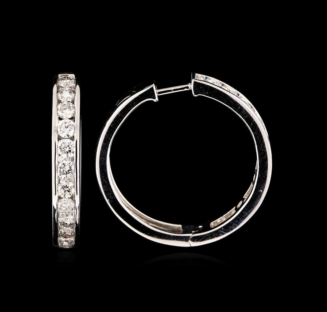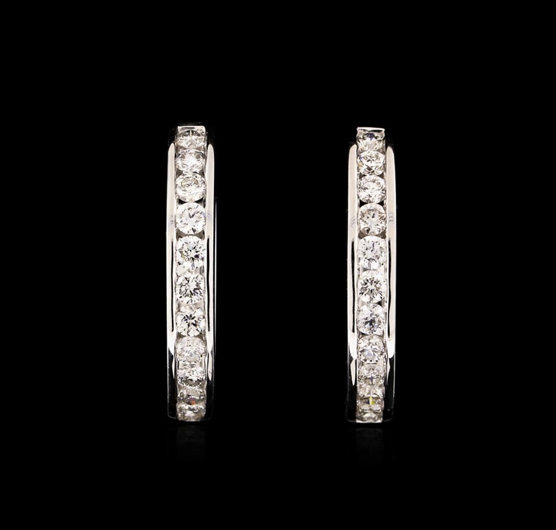 One pair electronically tested 18KT white gold lady's combination cast & assembled hoop style earrings with hinged, snap locking posts with a bright polish finish. Identified with markings of "18K 750". Condition is new, good workmanship. Containing: Twenty-Four channel set round brilliant cut diamonds, measuring 2.90 - 2.80 x 1.71mm (depth est.) approximate total weight of 24 Stones = 2.04ct. Graded in the setting. Clarity: VS-2 to SI-2. Color: H - I. Cut Very Good. Total Weight of Diamonds 2.04ct. Total Weight of Earrings 9.70gm. GAS Appraised at $7,625.00.