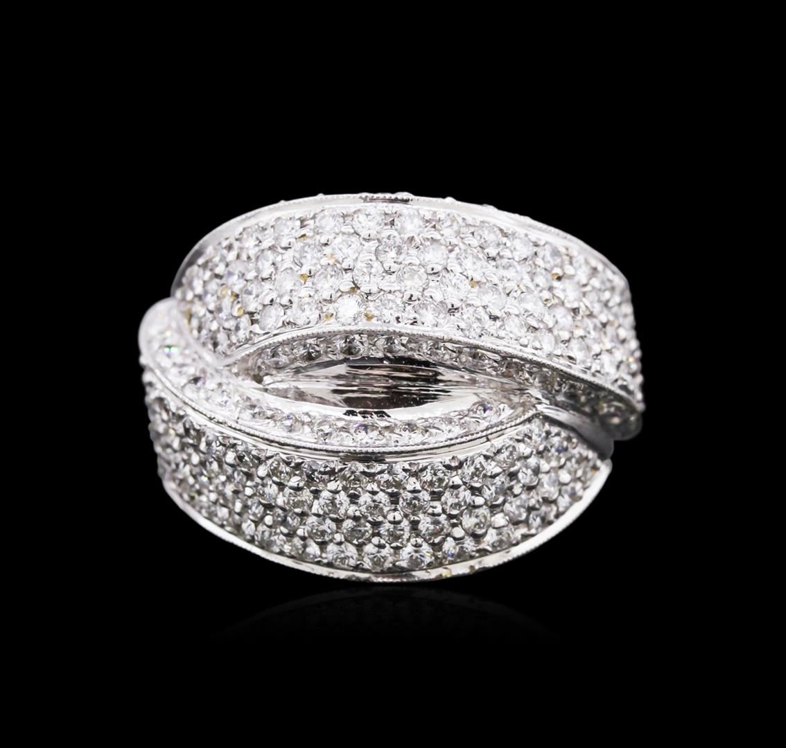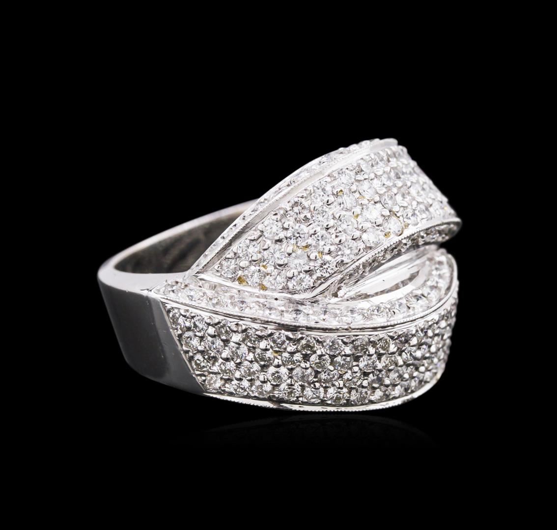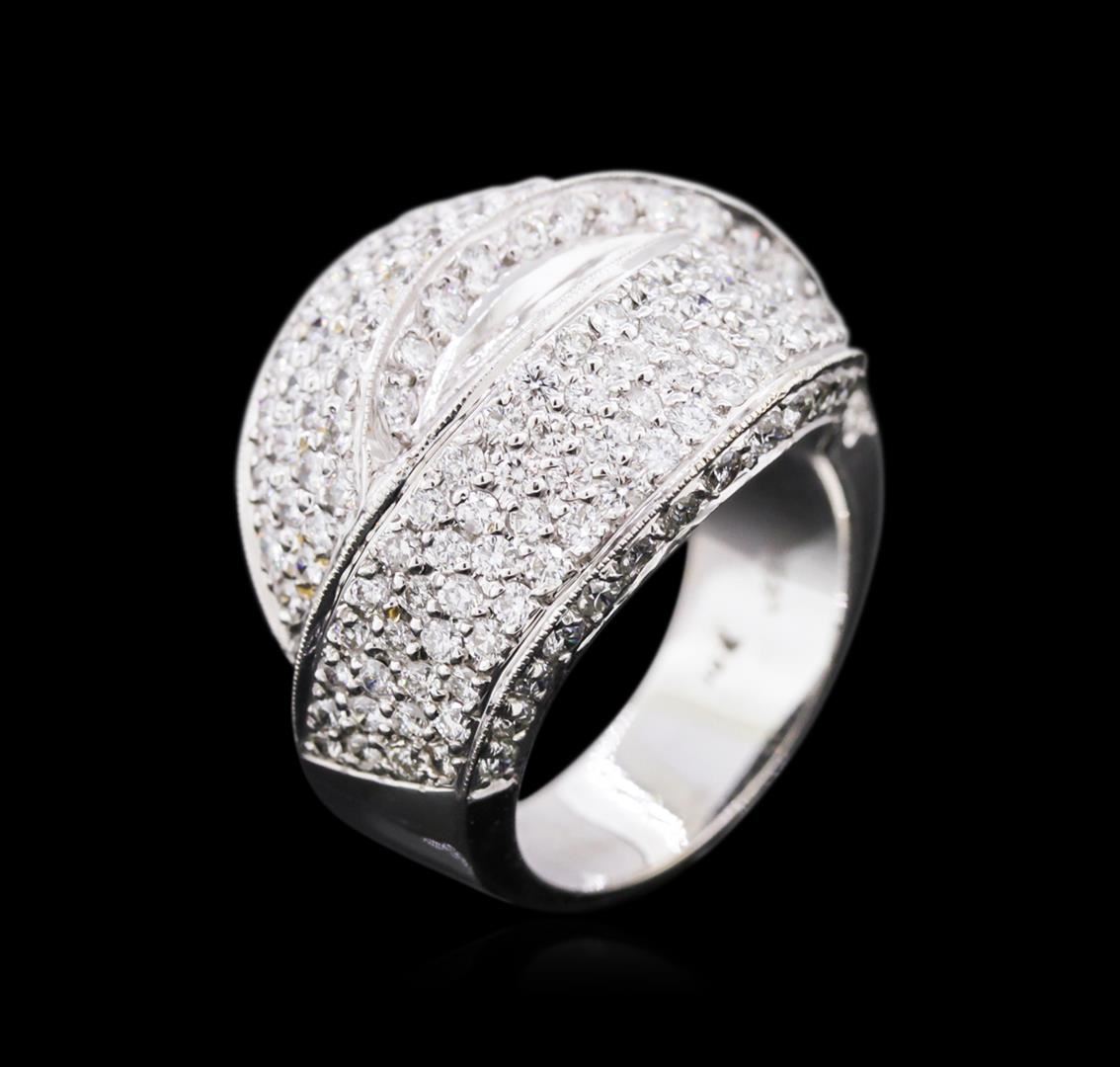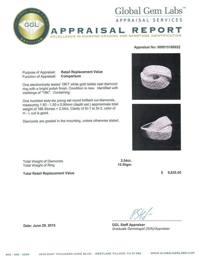 One electronically tested 18KT white gold ladies cast diamond ring with a bright polish finish. Identified with markings of "18K". Condition is new. Containing: One Hundred Sixty-Six prong set round brilliant cut diamonds, measuring 1.50 - 1.50 x 0.90mm (depth est.) approximate total weight of 166 Stones = 2.04ct. Clarity: SI-1 to SI-2. Color: H - I, Cut is Good. Diamonds are graded in the mounting, unless otherwise stated. Total Weight of Diamonds 2.04ct. Total Weight of Ring 15.50 grams. GGL Appraised at $6,835.00.