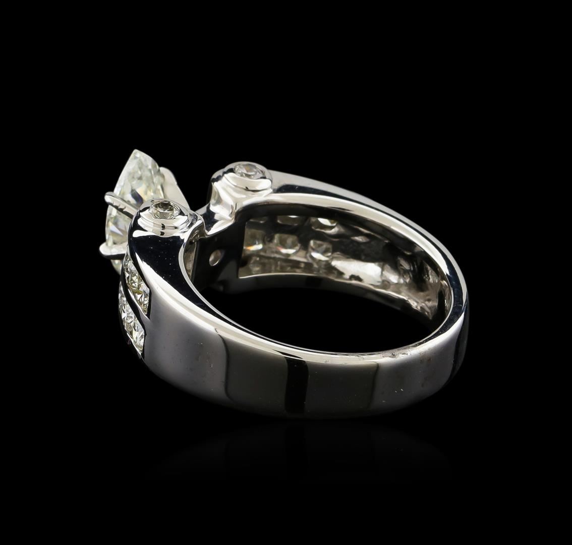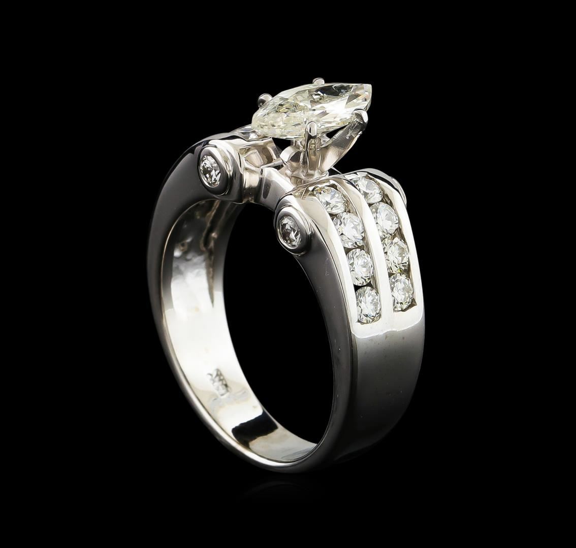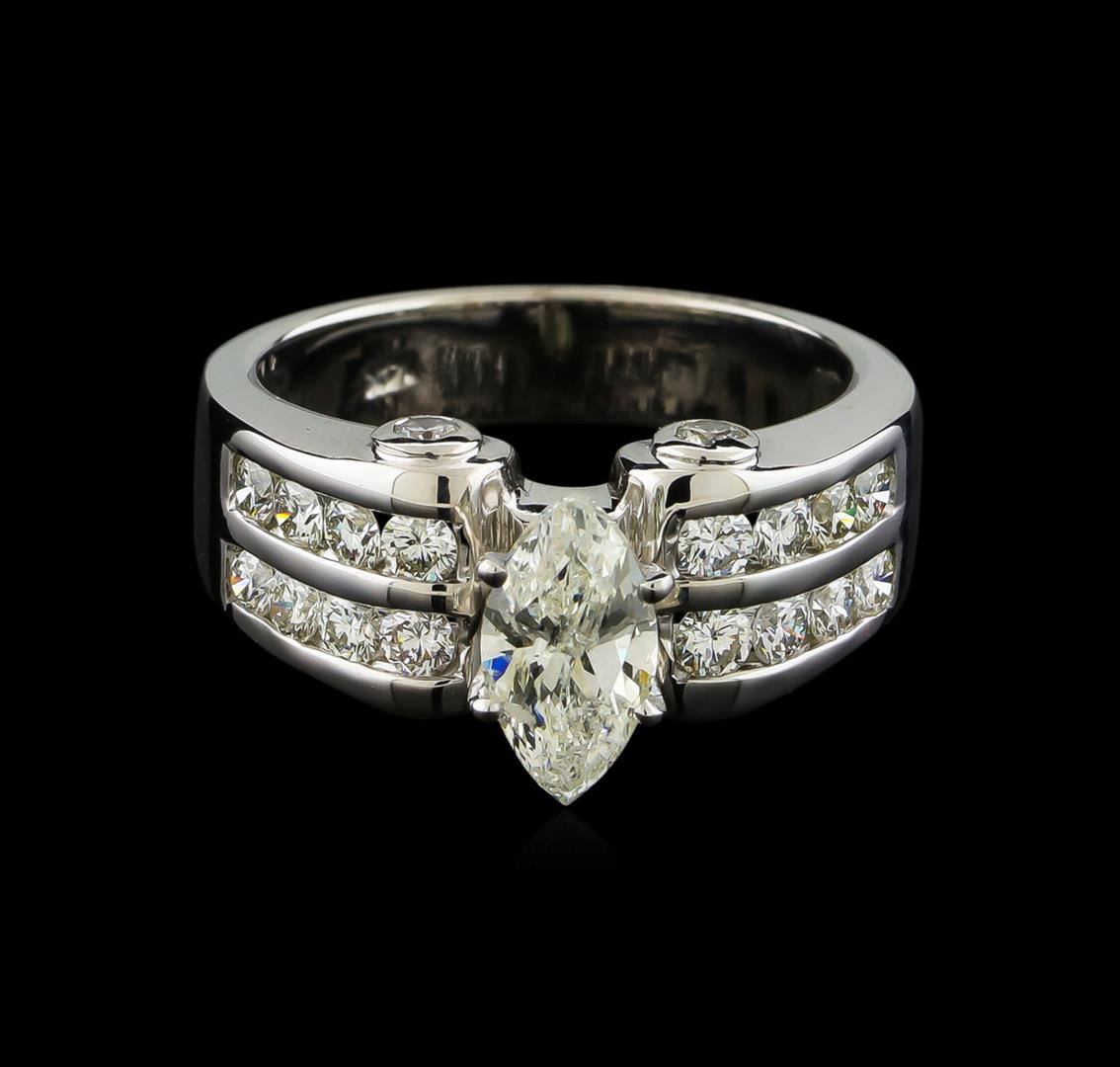 One electronically tested 14KT white gold ladies cast & assembled diamond unity ring with a bright polish finish. The featured diamond is supported by elaborate diamond set shoulders, completed by a four and one-half millimeter wide band. Identified with markings of "14K". Condition is good. Containing: One prong set marquise shaped cut diamond, measuring 9.70 x 5.05 x 3.15mm (depth est.), 6.00.%. GTCF approximate weight of 1.05ct with a medium blue fluorescence. Graded in the setting. Clarity: I-1. Color: I. Depth 62.4%. Table 51.5%. Twenty channel set round brilliant cut diamonds, measuring 2.40 - 2.20 x 1.38mm (depth est.) approximate total weight of 20 Stones = 1.00ct. Graded in the setting. Clarity: VS-1 to VS-2. Color: G - I. Total Weight of Diamonds 2.05ct. Total Weight of Ring 7.71gm. AIG Appraised at $11,275.00.