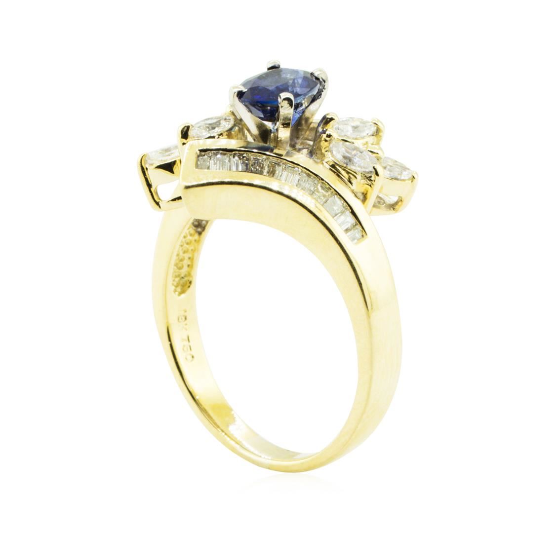 One electronically tested 18KT yellow gold lady's combination cast & assembled fashion bypass ring with a waterfall cluster motif with a bright polish finish. The featured lady's ring has a shank measuring 2.60 millimeters in width. Identified with markin