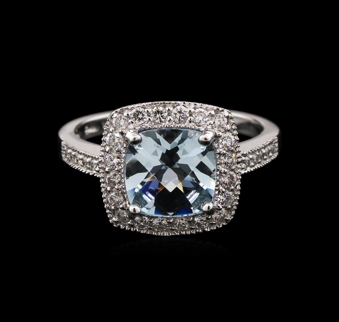 One electronically tested 14KT white gold lady's cast fashion ring with a cushion halo with a bright polish with milgrain detailing finish. The featured lady's ring has a shank measuring 1.90 millimeters wide. Identified with markings of "14K". Condition is new, good workmanship. Containing: One prong set square cushion modified brilliant cut natural aquamarine, measuring 8.16 x 8.08 x 4.86mm, approximate weight of 2.05ct., clarity is eye clean, type I, medium light, very slightly grayish, greenish blue color, (GIA gB 4/3), cut is very good. Transmitting light with no distortion, transparent. Colored gemstones are presumed to have been subjected to commonly used enhancement processes. Graded in the setting. Twenty bead set round brilliant cut diamonds, measuring 1.60 - 1.50 x 1.01mm (depth est.) approximate. Total Weight of 20 Stones = 0.25ct. Clarity: VS-2 to SI-1. Color: H - I. Cut Good Ten prong set round brilliant cut diamonds, measuring 1.20 - 1.10 x 0.75mm (depth est.) approximate. Total Weight of 10 Stones = 0.06ct. Graded in the setting. Clarity: VS-2 to SI-1. Color: H - I. Cut Good. Total Weight of Colored Stones 2.05ct. Total Weight of Diamonds 0.31ct. Total Weight of Ring 4.50gm. GAS Appraised at $3,545.00.