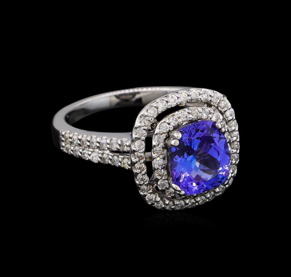 One electronically tested 14KT white gold lady's cast fashion ring with a split shank double halo with a bright polish finish. The featured lady's ring has a shank measuring 2.14 millimeters wide. Identified with markings of "K14". Condition is new, good workmanship. Containing: One prong set rectangular cushion modified brilliant cut natural tanzanite, measuring 8.22 x 7.08 x 4.52mm, approximate weight of 2.05ct., clarity is eye clean, type I, medium, very slightly grayish, bluish violet color, (GIA bV 5/3), cut is very good. Transmitting light with no distortion, transparent. Graded in the setting. Colored gemstones are presumed to have been subjected to commonly used enhancement processes. Twenty-Eight prong set round brilliant cut diamonds, measuring 1.35 - 1.25 x 0.81mm (depth est.) approximate total weight of 28 Stones = 0.24ct. Graded in the setting. Clarity: SI-1 to SI-2. Color: G - H. Cut Good Fifty-Two prong set round brilliant cut diamonds, measuring 1.20 - 1.15 x 0.73mm (depth est.) approximate total weight of 52 Stones = 0.33ct. Graded in the setting. Clarity: SI-1 to I-1. Color: H - I. Cut Good. Total Weight of Colored Stones 2.05ct. Total Weight of Diamonds 0.57ct. Total Weight of Ring 5.50gm. GAS Appraised at $6,205.00.