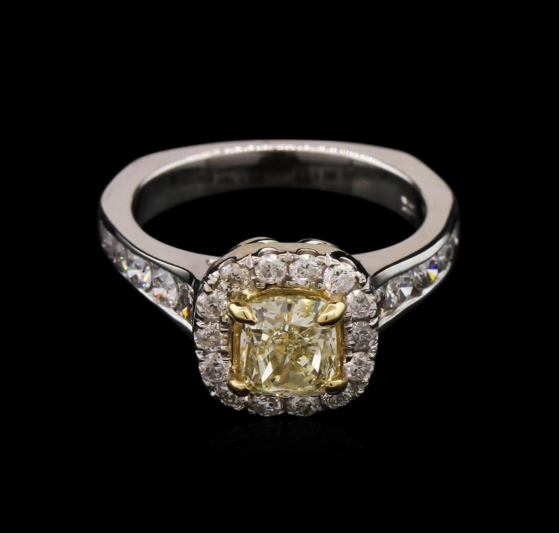 One electronically tested 14KT white gold ladies cast diamond ring. The featured diamond is set within an inner yellow gold basket and an outer diamond bezel supported by tapering diamond set shoulders, completed by a two and one-half millimeter wide band. Identified with markings of "14K". Condition is new, good workmanship. Containing: One prong set cushion cut diamond, measuring 5.80 x 5.20 x 3.35mm, 10.00.%. GTCF exact weight 1.14ct. Graded in the setting. Clarity: VS-1. Depth: 64.4%. Table 67.3%. Twenty-Four prong & channel set round brilliant cut diamonds, measuring 2.60 - 1.70 x 1.29mm exact total weight 24 Stones = 0.91ct. Graded in the setting. Clarity: SI-1 to I-1. Color: G - I. Total Weight of Diamonds 2.05ct. Total Weight of Ring 6.08gm. AIG Appraised at $10,025.00.