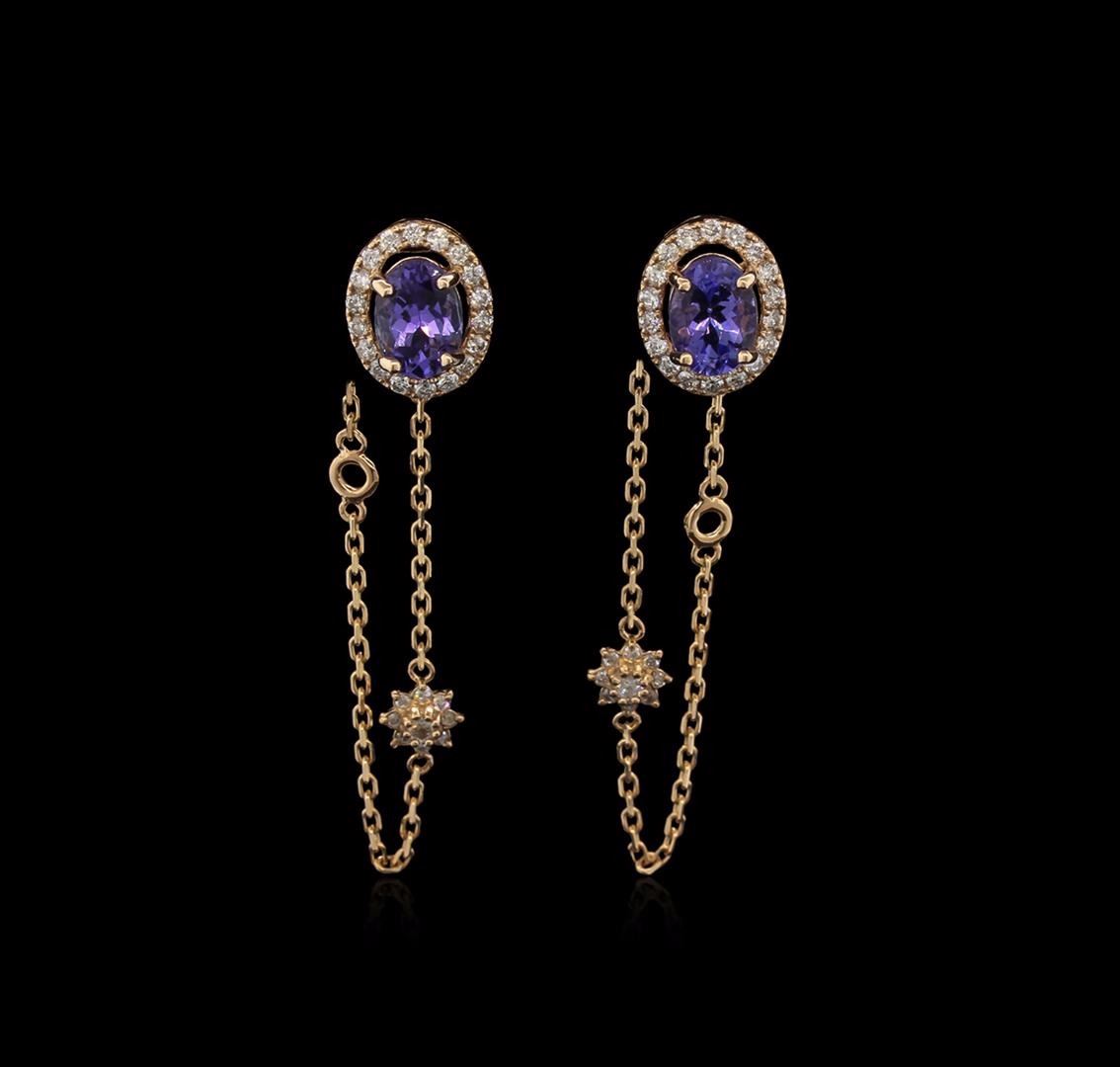 One pair of earrings featuring: 14KT rose gold weighing 5.08 grams containing two tanzanites with a total weight of 2.05ct and 54 diamonds with a total weight of 0.48ct.