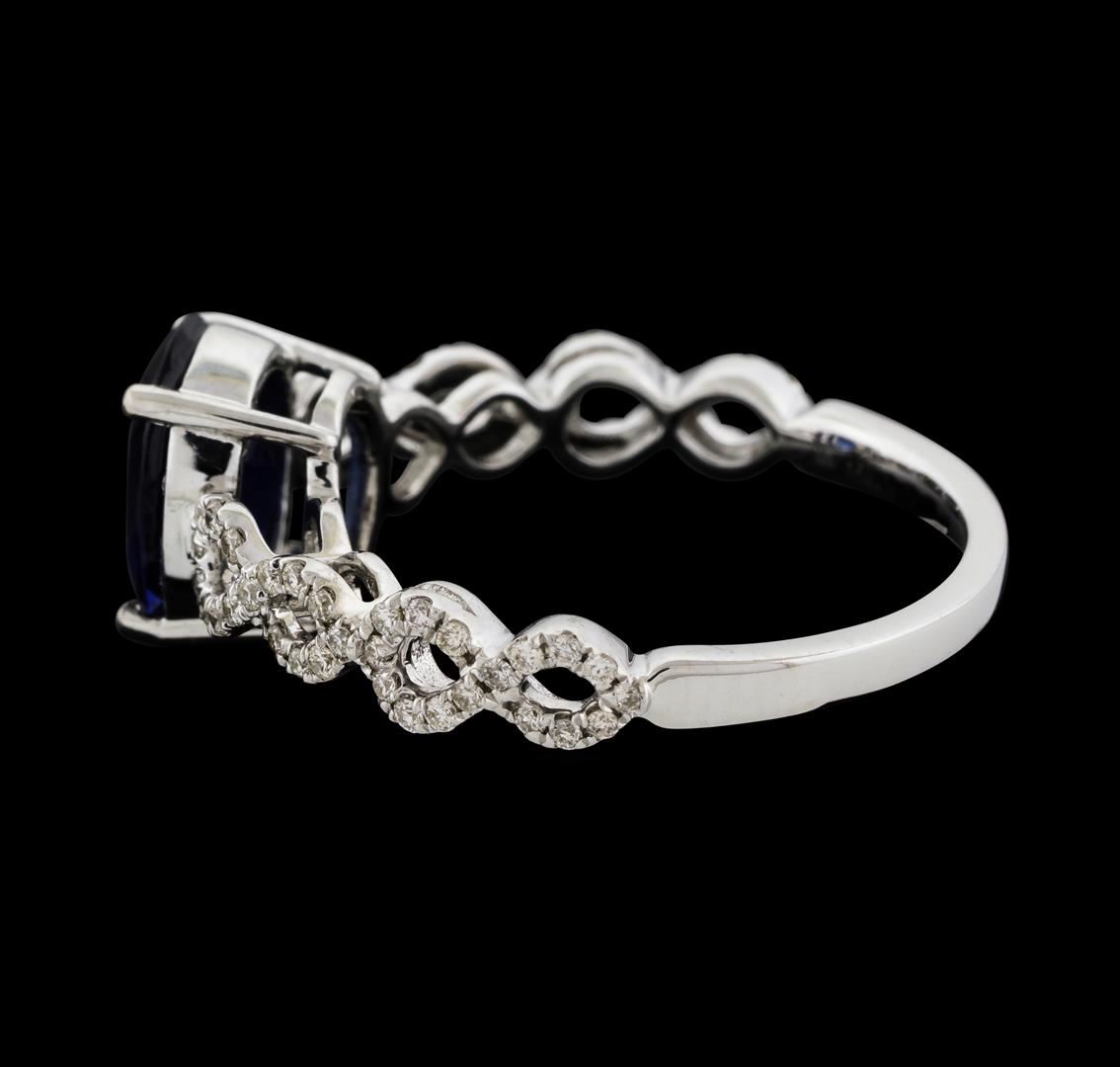 One electronically tested 14KT white gold lady's cast fashion ring with a split crossover shank with a bright polish finish. The featured lady's ring has shoulders composed of connected, twin infinity motifs and a shank measuring 1.58 millimeters wide. Identified with markings of '14K'. Condition is new, good workmanship. Containing: One prong set oval modified mixed cut natural blue sapphire, measuring 9.00 x 7.25 x 3.54mm, (depth est.) 5%. bulge factor, approximate weight of 2.06ct., clarity is slightly included, medium dark, moderately strong, blue color, (GIA B 6/4), cut is good. Transmitting light with a minimum of distortion, transparent. Colored gemstones are presumed to have been subjected to commonly used enhancement processes. Graded in the setting. Sixty-Four prong set round brilliant cut diamonds, measuring 1.05 - 0.95 x 0.62mm (depth est.) approximate total weight of 64 Stones = 0.24ct. Graded in the setting. Clarity SI-1 to SI-2. Color: G - H Cut Good. Total Weight of Colored Stones 2.06ct.. Total Weight of Diamonds 0.24ct.. Total Weight of Ring 2.90gm. GAS Appraised at $4,540.00.
