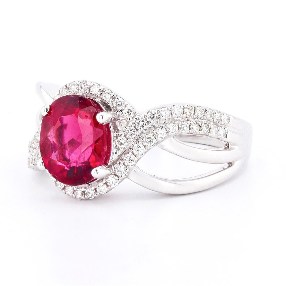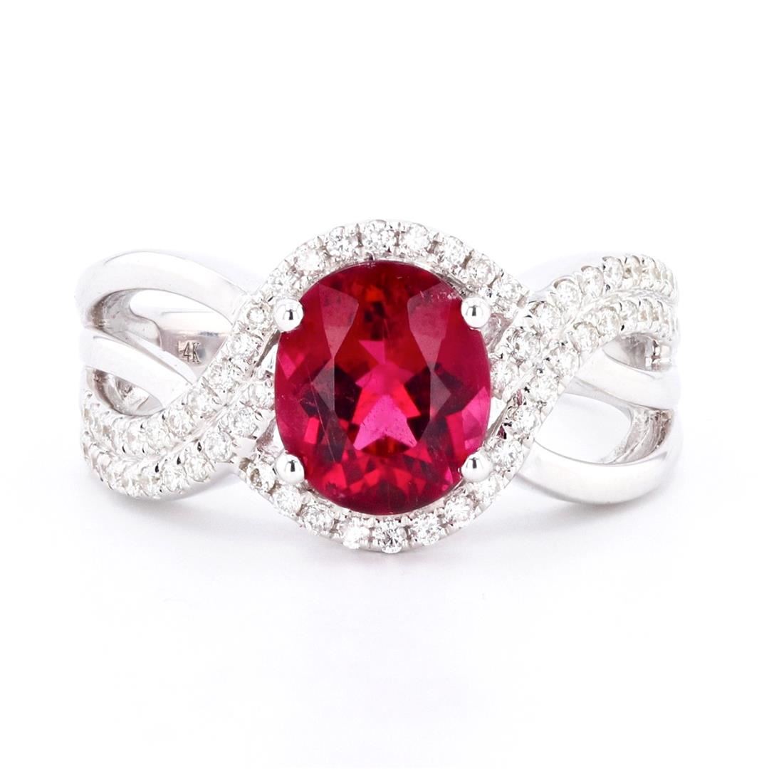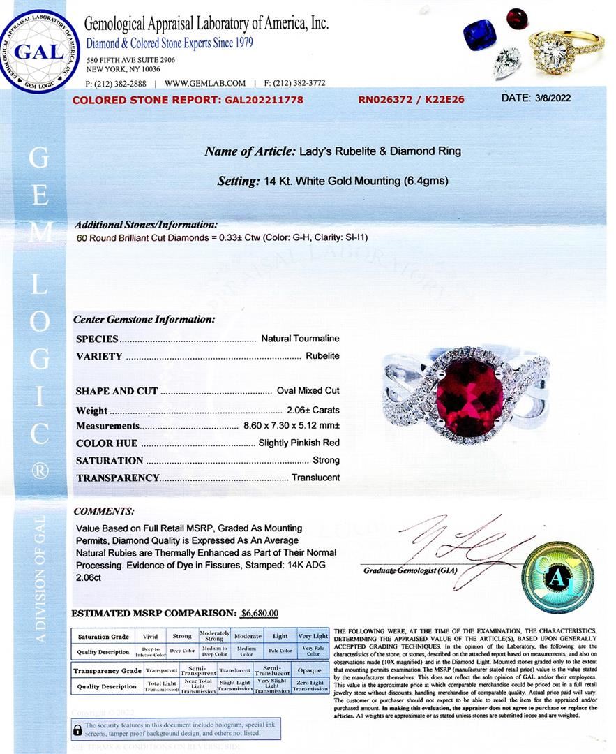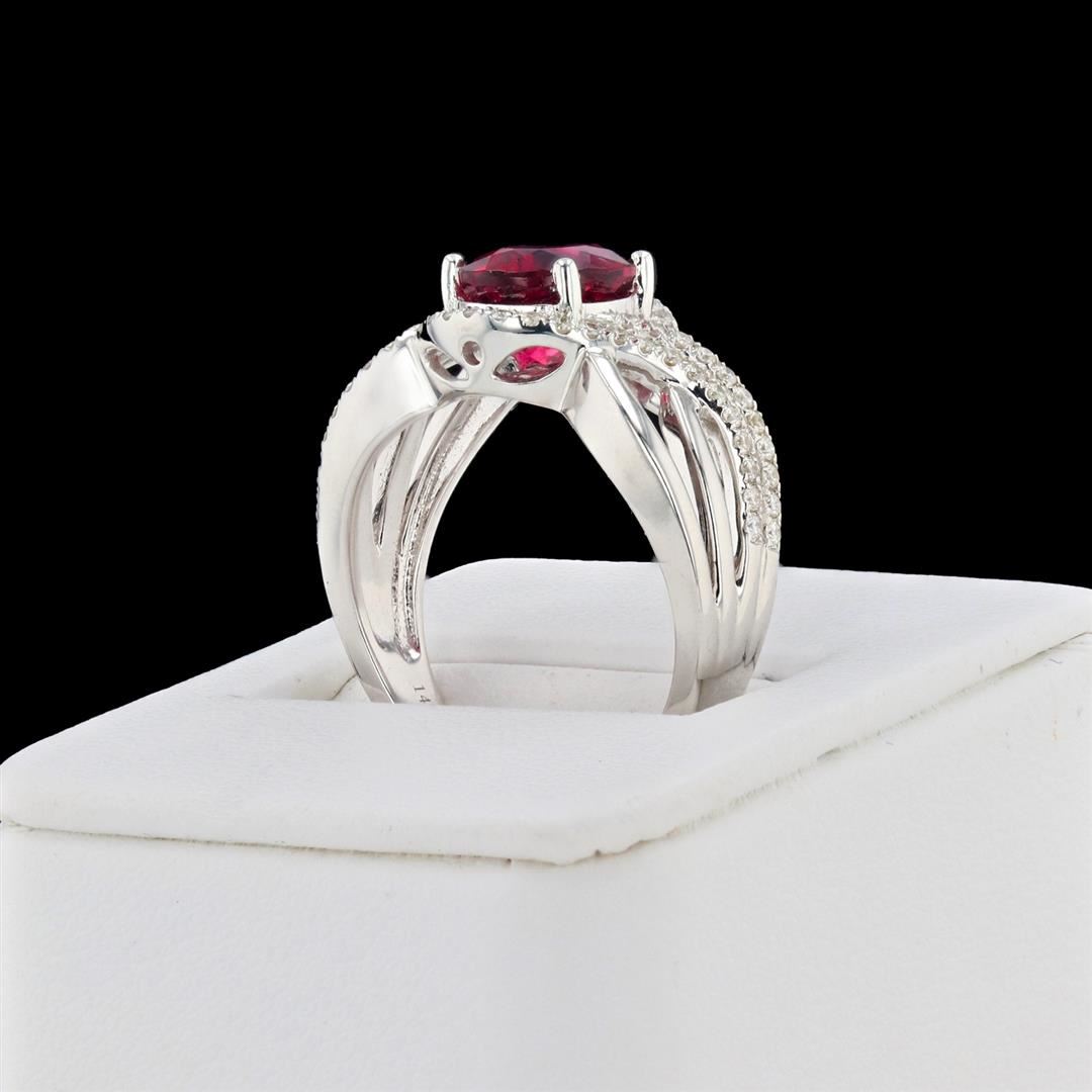 2.06CT Rubelite Natural Tourmaline and 0.33ctw Diamond 14K White Gold Ring. Please see Photos and Description for all available information. This unique ring is made with 60 round brilliant cut diamonds and one 2.06ct tourmaline with a beautiful color. The color of this tourmaline is blue, but the light hits it in different angles and it changes color to purple. The ring is made in 14K white gold. This ring is available in size 7.