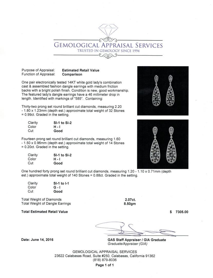 One pair electronically tested 14KT white gold lady's combination cast & assembled fashion dangle earrings with medium friction backs with a bright polish finish. The featured lady's dangle earrings have a 46 millimeter drop in length. Identified with markings of "585". Condition is new, good workmanship. Containing: Thirty-Two prong set round brilliant cut diamonds, measuring 2.20 - 1.80 x 1.23mm (depth est.) approximate total weight of 32 Stones = 0.99ct. Graded in the setting. Clarity: SI-1 to SI-2. Color: H - I. Cut Good Fourteen prong set round brilliant cut diamonds, measuring 1.60 - 1.50 x 0.96mm (depth est.) approximate total weight of 14 Stones = 0.20ct. Graded in the setting. Clarity: SI-1 to SI-2. Color: H - I. Cut Good One Hundred Forty prong set round brilliant cut diamonds, measuring 1.20 - 1.10 x 0.71mm (depth est.) approximate total weight of 140 Stones = 0.88ct. Graded in the setting. Clarity: SI-1 to I-1. Color: G - I. Cut Good. Total Weight of Diamonds 2.07ct. Total Weight of Dangle Earrings 8.50gm. GAS Appraised at $7,305.00.