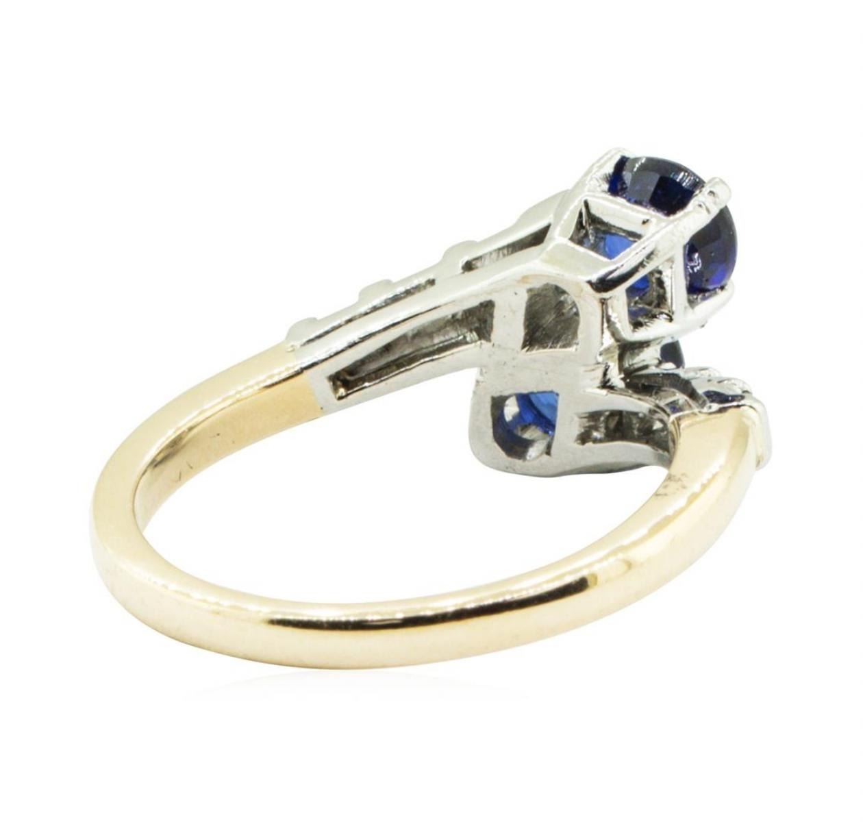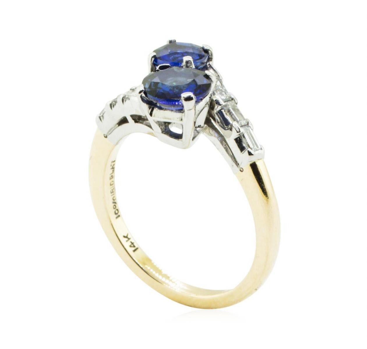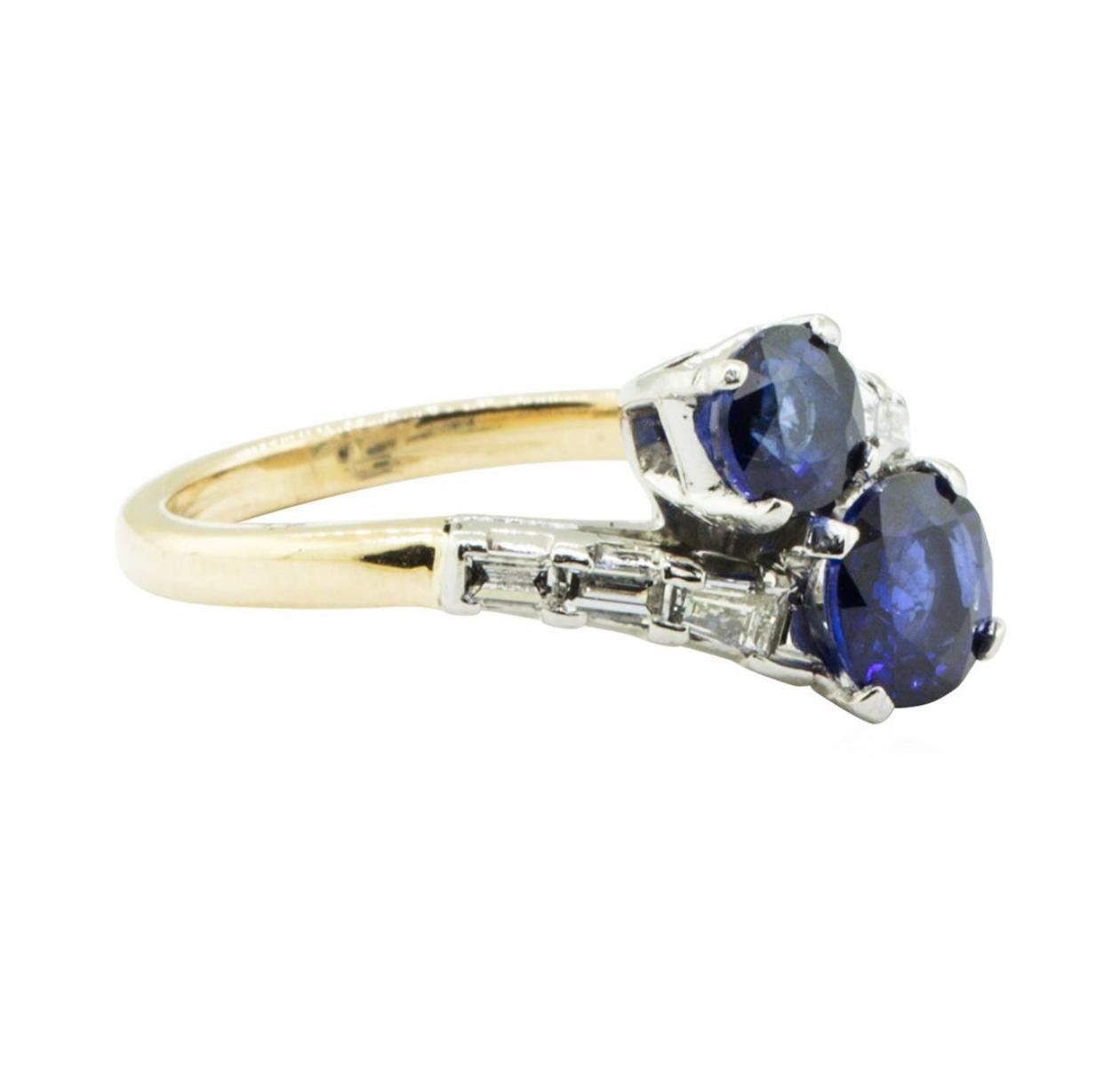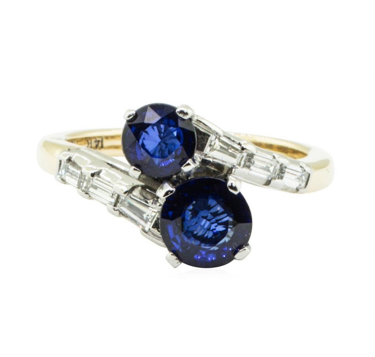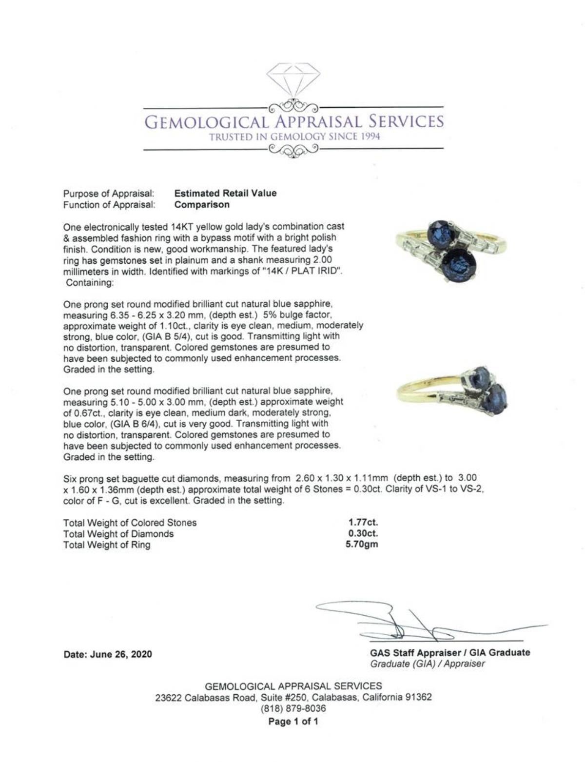 One electronically tested 14KT yellow gold lady's combination cast & assembled fashion ring with a bypass motif with a bright polish finish. The featured lady's ring has gemstones set in plainum and a shank measuring 2.00 millimeters in width. Identified with markings of '14K / PLAT IRID'. Condition is new, good workmanship. Containing: One prong set round modified brilliant cut natural blue sapphire, measuring 6.35 - 6.25 x 3.20 mm, (depth est.) 5%. bulge factor, approximate weight of 1.10 ct., clarity is eye clean, medium, moderately strong, blue color, (GIA B 5/4), cut is good. Transmitting light with no distortion, transparent. Colored gemstones are presumed to have been subjected to commonly used enhancement processes. Graded in the setting. One prong set round modified brilliant cut natural blue sapphire, measuring 5.10 - 5.00 x 3.00 mm, (depth est.) approximate weight of 0.67ct., clarity is eye clean, medium dark, moderately strong, blue color, (GIA B 6/4), cut is very good. Transmitting light with no distortion, transparent. Colored gemstones are presumed to have been subjected to commonly used enhancement processes. Graded in the setting. Six prong set baguette cut diamonds, measuring from 2.60 x 1.30 x 1.11mm (depth est.) to 3.00 x 1.60 x 1.36mm (depth est.) approximate total weight of 6 Stones = 0.30 ct. Graded in the setting. Color F - G Clarity VS-1 to VS-2 Cut Excellent. Total Weight of Colored Stones 1.77ct.. Total Weight of Diamonds 0.30 ct.. Total Weight of Ring 5.70gm GAS Appraised at $4675.00. GAS Appraised.