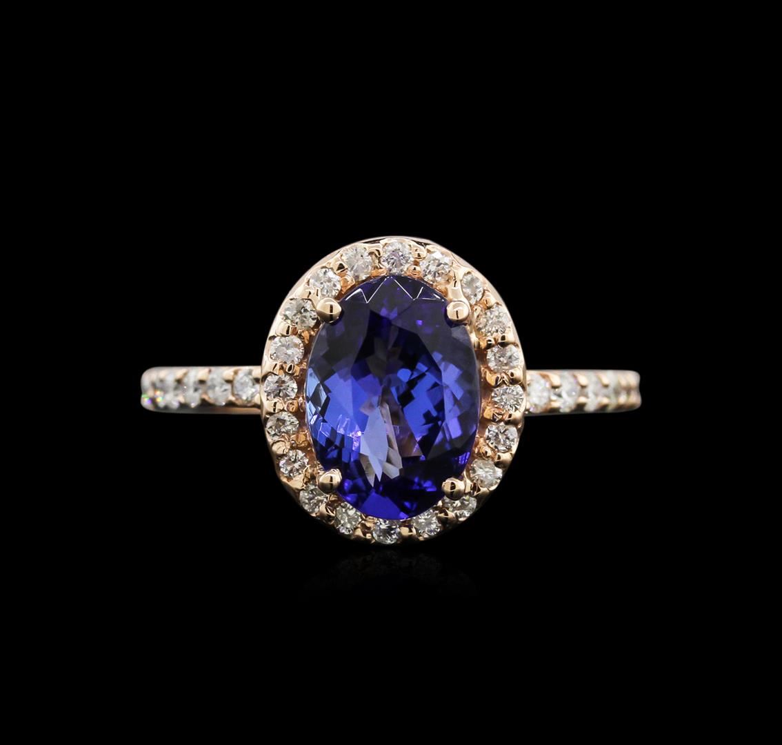 One electronically tested 14KT rose gold lady's cast fashion ring with a basket setting with a bright polish finish. The featured lady's ring has a halo motif with a shank measuring 1.72 millimeters in width. Identified with markings of "K14". Condition is new, good workmanship. Containing: One prong set oval modified brilliant cut natural tanzanite, measuring 10.01 x 7.10 x 4.33mm, approximate weight of 2.07ct., clarity is eye clean, type I, medium dark, very slightly grayish, violet color, (GIA V 6/3), cut is good. Transmitting light with no distortion, transparent. Colored gemstones are presumed to have been subjected to commonly used enhancement processes. Graded in the setting. Thirty-Two prong set round brilliant cut diamonds, measuring 1.50 - 1.45 x 0.96mm (depth est.) approximate total weight of 32 Stones = 0.43ct. Graded in the setting. Clarity: SI-2 to I-1. Color: H - I. Cut Good. Total Weight of Colored Stones 2.07ct. Total Weight of Diamonds 0.43ct. Total Weight of Ring 3.80gm. GAS Appraised at $4,920.00.