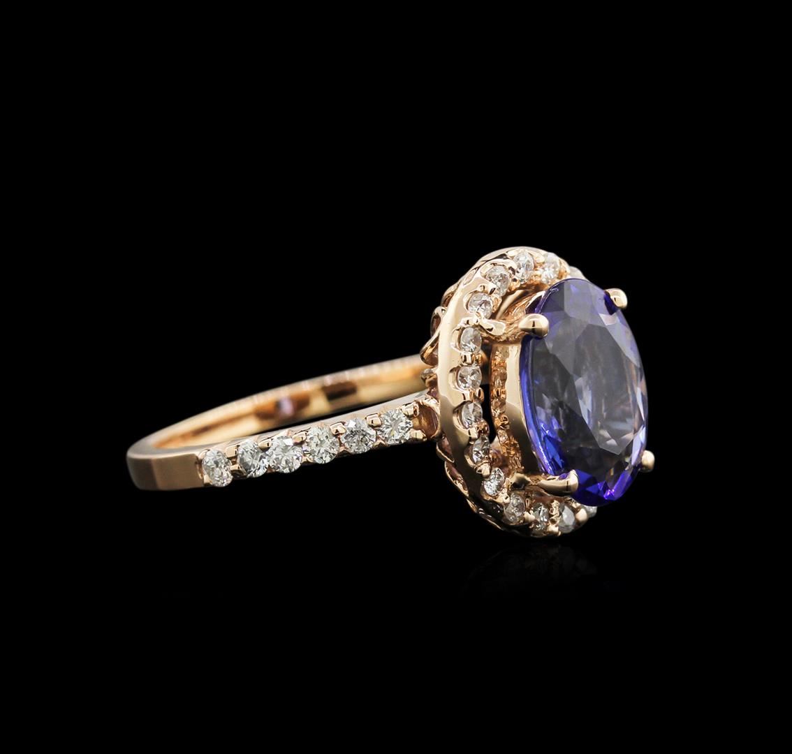 One electronically tested 14KT rose gold lady's cast fashion ring with a basket setting with a bright polish finish. The featured lady's ring has a halo motif with a shank measuring 1.72 millimeters in width. Identified with markings of "K14". Condition is new, good workmanship. Containing: One prong set oval modified brilliant cut natural tanzanite, measuring 10.01 x 7.10 x 4.33mm, approximate weight of 2.07ct., clarity is eye clean, type I, medium dark, very slightly grayish, violet color, (GIA V 6/3), cut is good. Transmitting light with no distortion, transparent. Colored gemstones are presumed to have been subjected to commonly used enhancement processes. Graded in the setting. Thirty-Two prong set round brilliant cut diamonds, measuring 1.50 - 1.45 x 0.96mm (depth est.) approximate total weight of 32 Stones = 0.43ct. Graded in the setting. Clarity: SI-2 to I-1. Color: H - I. Cut Good. Total Weight of Colored Stones 2.07ct. Total Weight of Diamonds 0.43ct. Total Weight of Ring 3.80gm. GAS Appraised at $4,920.00.