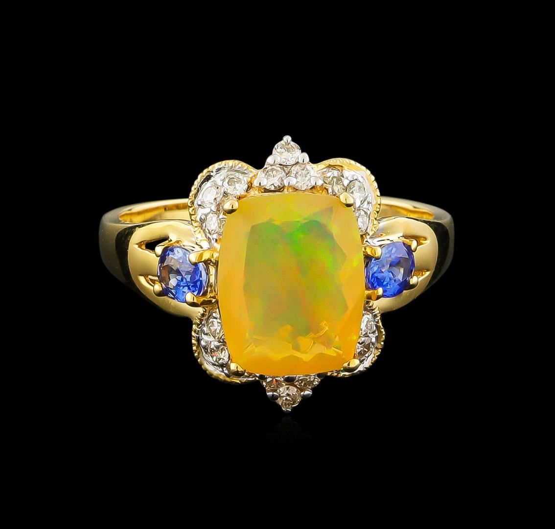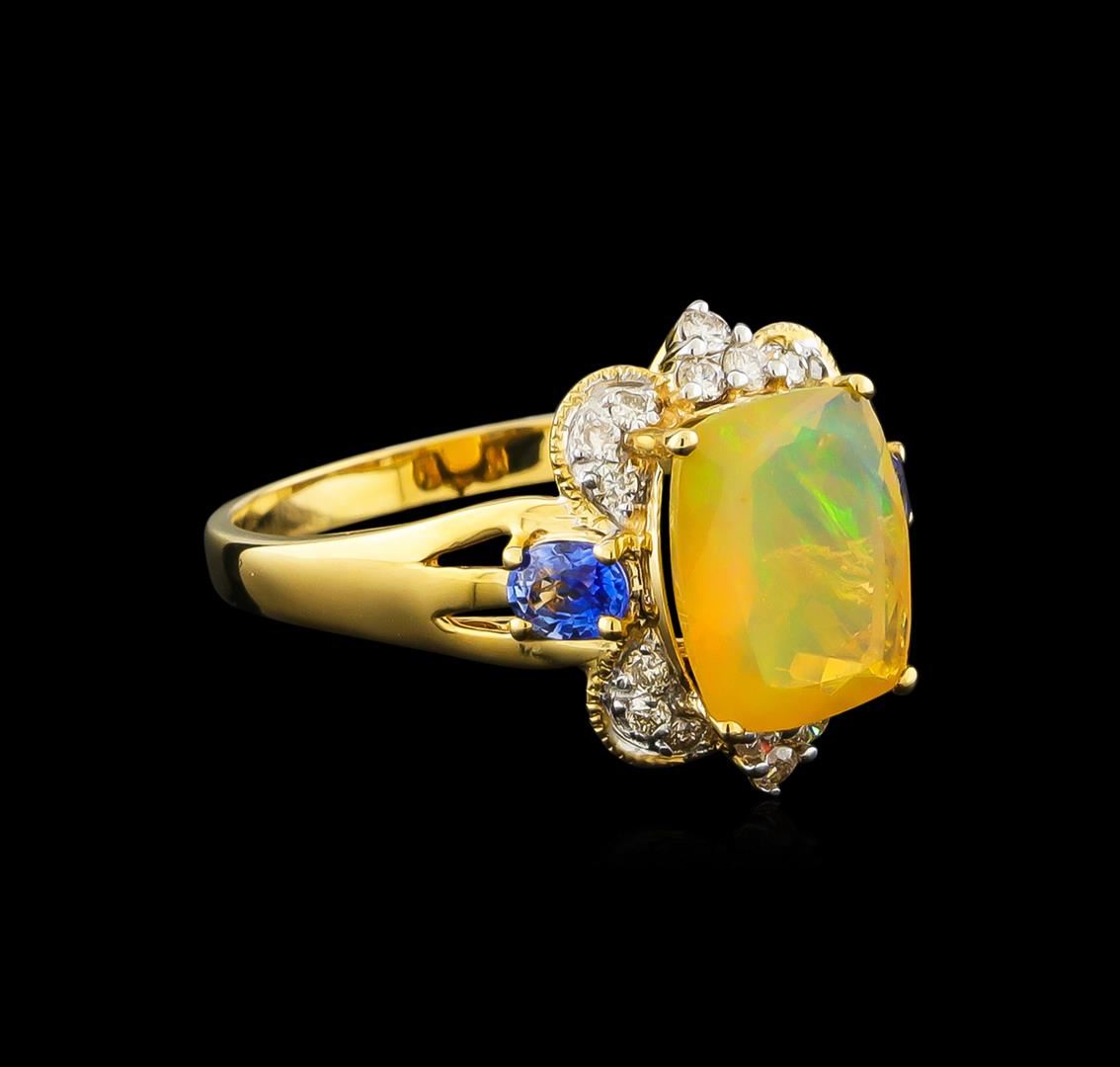 One electronically tested 14KT yellow gold ladies cast opal, blue sapphire and diamond ring. The featured opal is set within a stylized diamond bezel with blue sapphire accents, completed by a two millimeter wide band. Bright polish finish with rhodium accents and milgrain detailing. Trademark is CJ. Identified with markings of "14K". Condition is new, good workmanship. Containing: One semi crystal opal that is cut in a rectangular cushion shape and is prong set, measuring 10.05 mm long x 7.90 mm wide, and 4.45 mm thick and the approximate weight is 2.07 carats. The opal has a somewhat bright, multicolor play of color (fire) in a flashfire pattern; a dome; a good cut; no inclusions; minor dull spot in its brightness and pattern; and is slightly directional. Graded in the setting. Two prong set oval mixed cut natural blue sapphires, measuring 4.00 x 3.00 x 2.00mm, approximate total weight of 0.45ct., clarity is eye clean, type II, medium, very slightly grayish, blue color, (GIA B 5/3), cut is good. Transmitting light with no distortion, transparent. Measurements & the color grade are an average for the pair. Graded in the setting. Eighteen prong set round brilliant cut diamonds, measuring 1.50 - 1.40 x 0.87mm (depth est.) approximate total weight of 18 Stones = 0.25ct. Graded in the setting. Clarity: I-1 to I-2. Color: H - I. Total Weight of Colored Stones 0.45ct. Total Weight of Diamonds 0.25ct. Total Weight of Opals 2.07ct. Total Weight of Ring 3.57gm. AIG Appraised at $2,010.00.