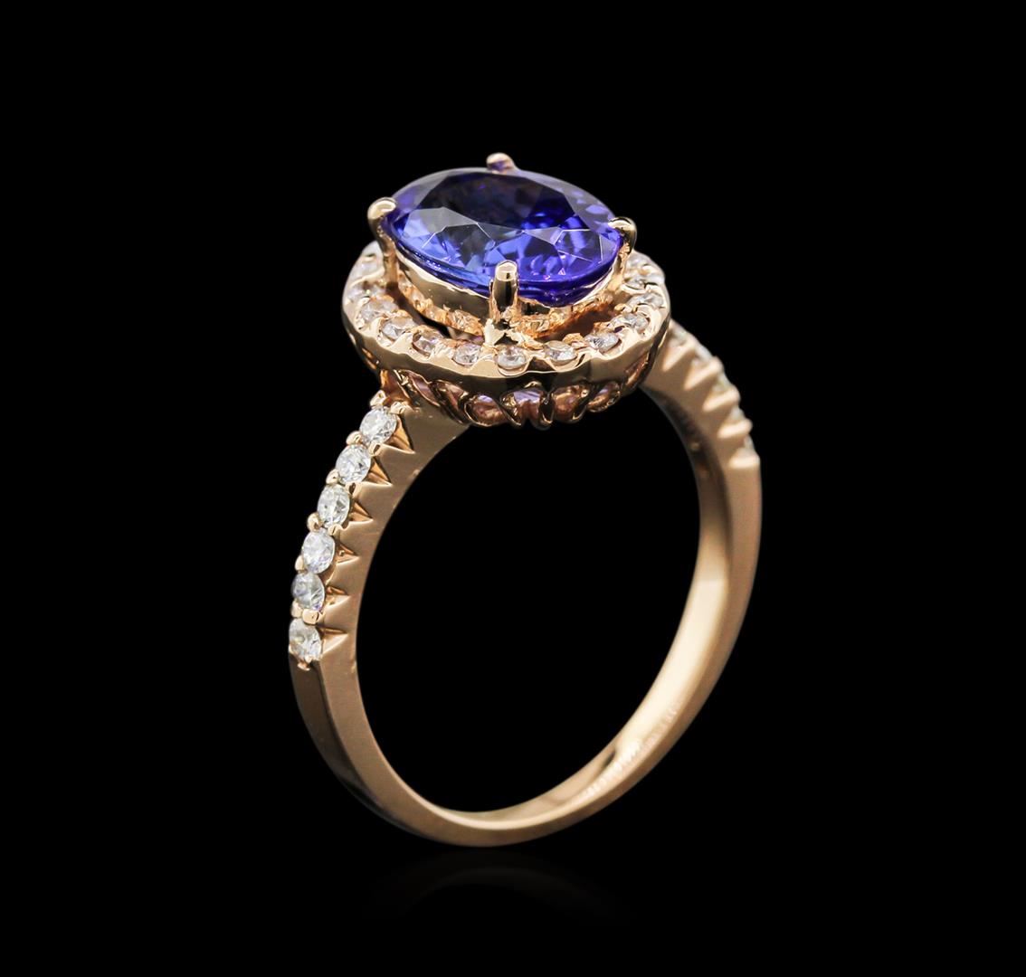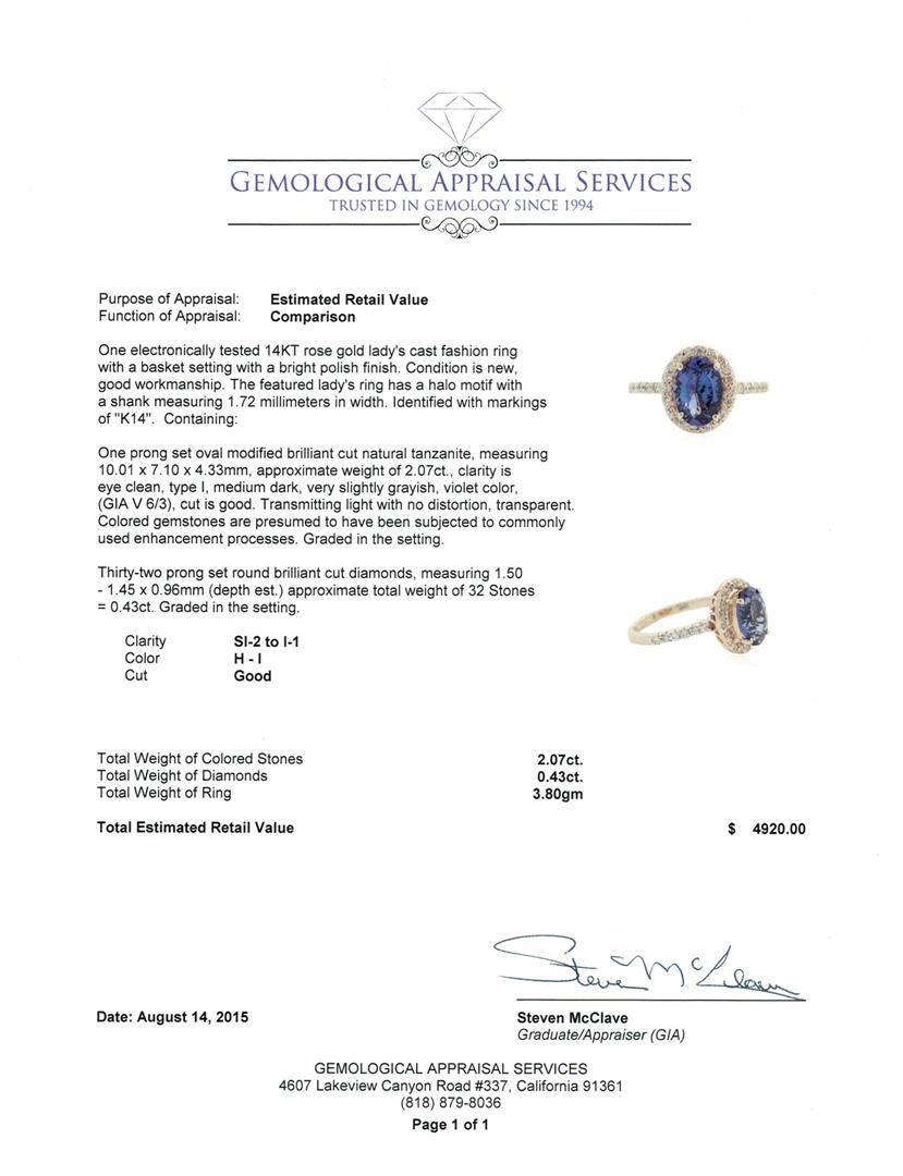 One electronically tested 14KT rose gold lady's cast fashion ring with a basket setting with a bright polish finish. The featured lady's ring has a halo motif with a shank measuring 1.72 millimeters in width. Identified with markings of "K14". Condition is new, good workmanship. Containing: One prong set oval modified brilliant cut natural tanzanite, measuring 10.01 x 7.10 x 4.33mm, approximate weight of 2.07ct., clarity is eye clean, type I, medium dark, very slightly grayish, violet color, (GIA V 6/3), cut is good. Transmitting light with no distortion, transparent. Colored gemstones are presumed to have been subjected to commonly used enhancement processes. Graded in the setting. Thirty-Two prong set round brilliant cut diamonds, measuring 1.50 - 1.45 x 0.96mm (depth est.) approximate total weight of 32 Stones = 0.43ct. Graded in the setting. Clarity: SI-2 to I-1. Color: H - I. Cut Good. Total Weight of Colored Stones 2.07ct. Total Weight of Diamonds 0.43ct. Total Weight of Ring 3.80gm. GAS Appraised at $4,920.00.