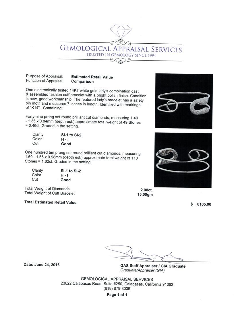 One electronically tested 14KT white gold lady's combination cast & assembled fashion cuff bracelet with a bright polish finish. The featured lady's bracelet has a safety pin motif and measures 7 inches in length. Identified with markings of "K14". Condition is new, good workmanship. Containing: Forty-Nine prong set round brilliant cut diamonds, measuring 1.40 - 1.35 x 0.84mm (depth est.) approximate total weight of 49 Stones = 0.46ct. Graded in the setting. Clarity: SI-1 to SI-2. Color: H - I. Cut Good One Hundred Ten prong set round brilliant cut diamonds, measuring 1.60 - 1.55 x 0.98mm (depth est.) approximate total weight of 110 Stones = 1.62ct. Graded in the setting. Clarity: SI-1 to SI-2. Color: H - I. Cut Good. Total Weight of Diamonds 2.08ct. Total Weight of Cuff Bracelet 15.00gm. GAS Appraised at $8,105.00.