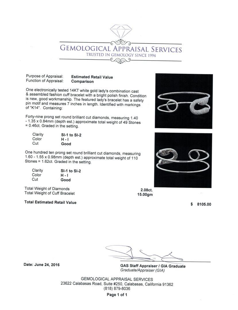 One electronically tested 14KT white gold lady's combination cast & assembled fashion cuff bracelet with a bright polish finish. The featured lady's bracelet has a safety pin motif and measures 7 inches in length. Identified with markings of "K14". Condition is new, good workmanship. Containing: Forty-Nine prong set round brilliant cut diamonds, measuring 1.40 - 1.35 x 0.84mm (depth est.) approximate total weight of 49 Stones = 0.46ct. Graded in the setting. Clarity: SI-1 to SI-2. Color: H - I. Cut Good One Hundred Ten prong set round brilliant cut diamonds, measuring 1.60 - 1.55 x 0.98mm (depth est.) approximate total weight of 110 Stones = 1.62ct. Graded in the setting. Clarity: SI-1 to SI-2. Color: H - I. Cut Good. Total Weight of Diamonds 2.08ct. Total Weight of Cuff Bracelet 15.00gm. GAS Appraised.