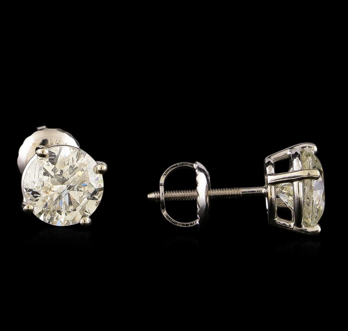One pair electronically tested 14KT white gold lady's combination cast & assembled diamond stud earrings with threaded posts and screw-on/screw-off backs with a basket setting with a bright polish finish. Identified with markings of "14K". Condition is new, good workmanship. Containing: One prong set round brilliant cut diamond, measuring 6.43 - 6.37 x 3.97mm (depth est.) approximate weight of 1.02ct. Graded in the setting. Clarity: I-1. Color: I. Cut Good One prong set round brilliant cut diamond, measuring 6.50 - 6.48 x 3.89mm (depth est.) approximate weight of 1.06ct. Graded in the setting. Clarity: I-1. Color: H - I. Cut Good. Total Weight of Diamonds 2.08ct. Total Weight of Stud Earrings 1.50gm. GAS Appraised at $16,590.00.