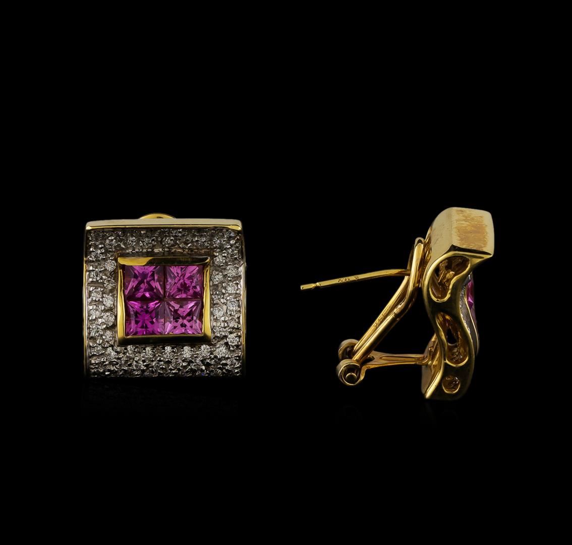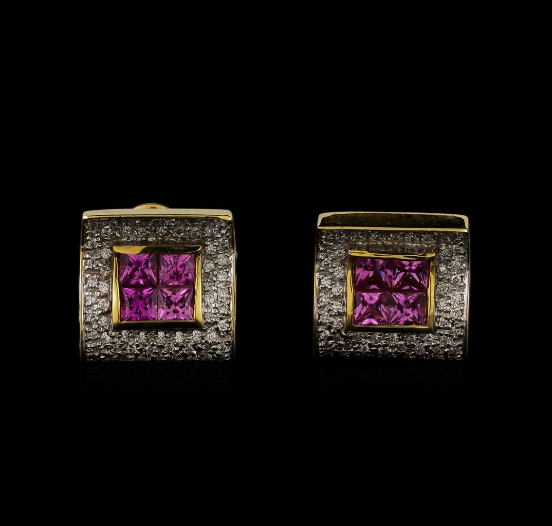 One pair electronically tested 14KT yellow gold ladies cast & assembled pink sapphire and diamond earrings with omega backs. Each earring features a central pink sapphire gallery framed by a diamond set square bezel. Bright polish finish with rhodium accents. Trademark is GUILD. Identified with markings of "14K". Condition is good. Containing: Eight invisible set square mixed cut natural pink sapphires, measuring 3.50 x 3.40 x 2.24mm, approximate total weight of 2.08ct., clarity is eye clean, medium, very slightly grayish, pink color, (GIA Pk 5/3), cut is good. Transmitting light with a minimum of distortion, transparent. Measurements & the color grade are an average for the group. Graded in the setting. One Hundred Twenty-Two prong set round brilliant cut diamonds, measuring 1.10 - 1.00 x 0.63mm (depth est.) approximate total weight of 122 Stones = 0.61ct. Graded in the setting. Clarity: SI-1 to I-1. Color: F - H. Total Weight of Colored Stones 2.08ct. Total Weight of Diamonds 0.61ct. Total Weight of Earrings 9.81gm. AIG Appraised at $5,170.00.