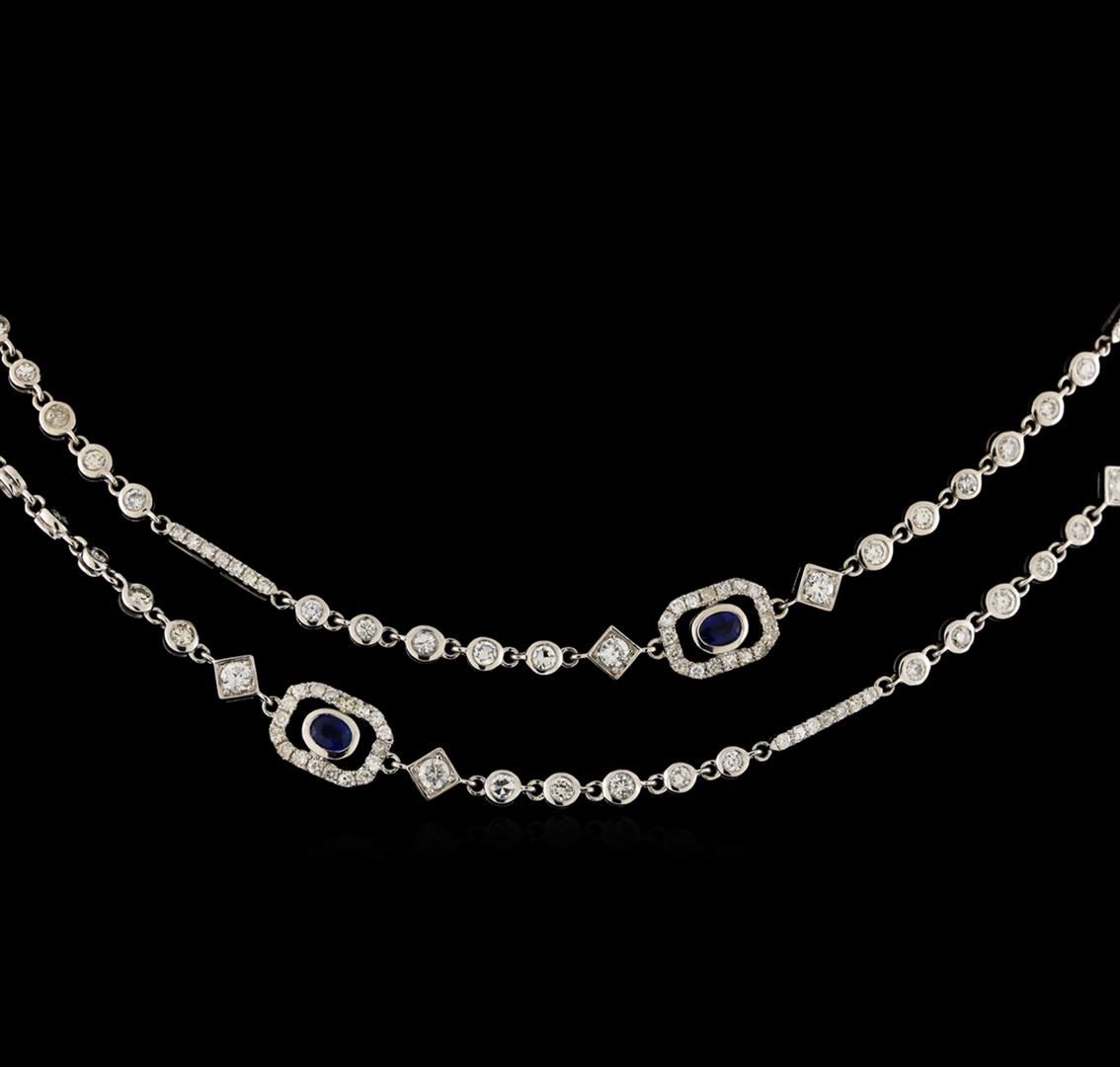 One electronically tested 18KT white gold lady's combination cast & assembled fashion necklace with a lobster claw clasp with a bright polish finish. The featured lady's necklace measures 32.75 inches in length. Identified with markings of "18K 750". Condition is new, good workmanship. Containing: Nine bezel set oval modified brilliant cut natural blue sapphires, measuring 4.20 x 3.20 x 2.08mm, (depth est.) approximate total weight of 2.08ct., clarity is eye clean, medium dark, moderately strong, violetish blue color, (GIA vB 6/4), cut is good. Transmitting light with a minimum of distortion, transparent. Colored gemstones are presumed to have been subjected to commonly used enhancement processes. Graded in the setting. Eighteen prong set round brilliant cut diamonds, measuring 2.80 - 2.75 x 1.67mm (depth est.) approximate total weight of 18 Stones = 1.40ct. Graded in the setting. Clarity: SI-1 to SI-2. Color: F - Good Eighty-Five bezel set round brilliant cut diamonds, measuring 2.40 - 2.35 x 1.43mm (depth est.) approximate total weight of 85 Stones = 4.00ct. Graded in the setting. Clarity: SI-1 to SI-2. Color: G - Good Two Hundred Eighteen prong set round brilliant cut diamonds, measuring 1.40 - 1.30 x 0.81mm (depth est.) approximate total weight of 218 Stones = 1.98ct. The featured lady's necklace has a mixture of full cut round brilliant and single cut round diamonds. Graded in the setting. Clarity: SI-1 to I-1. Color: H - I. Cut Good. Total Weight of Colored Stones 2.08ct. Total Weight of Diamonds 7.38ct. Total Weight of Necklace 29.70gm. GAS Appraised at $23,975.00.
