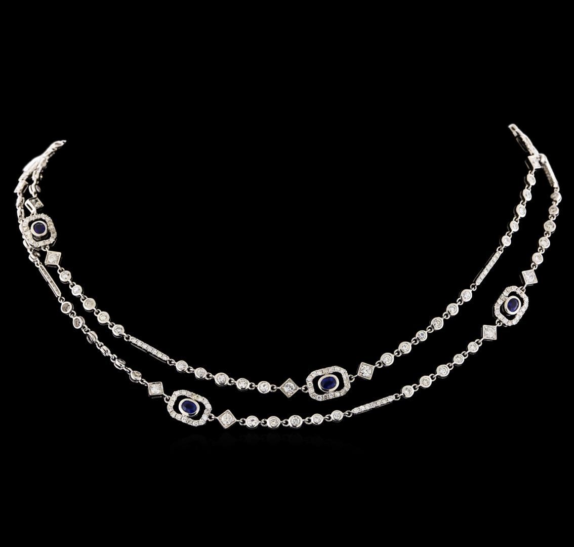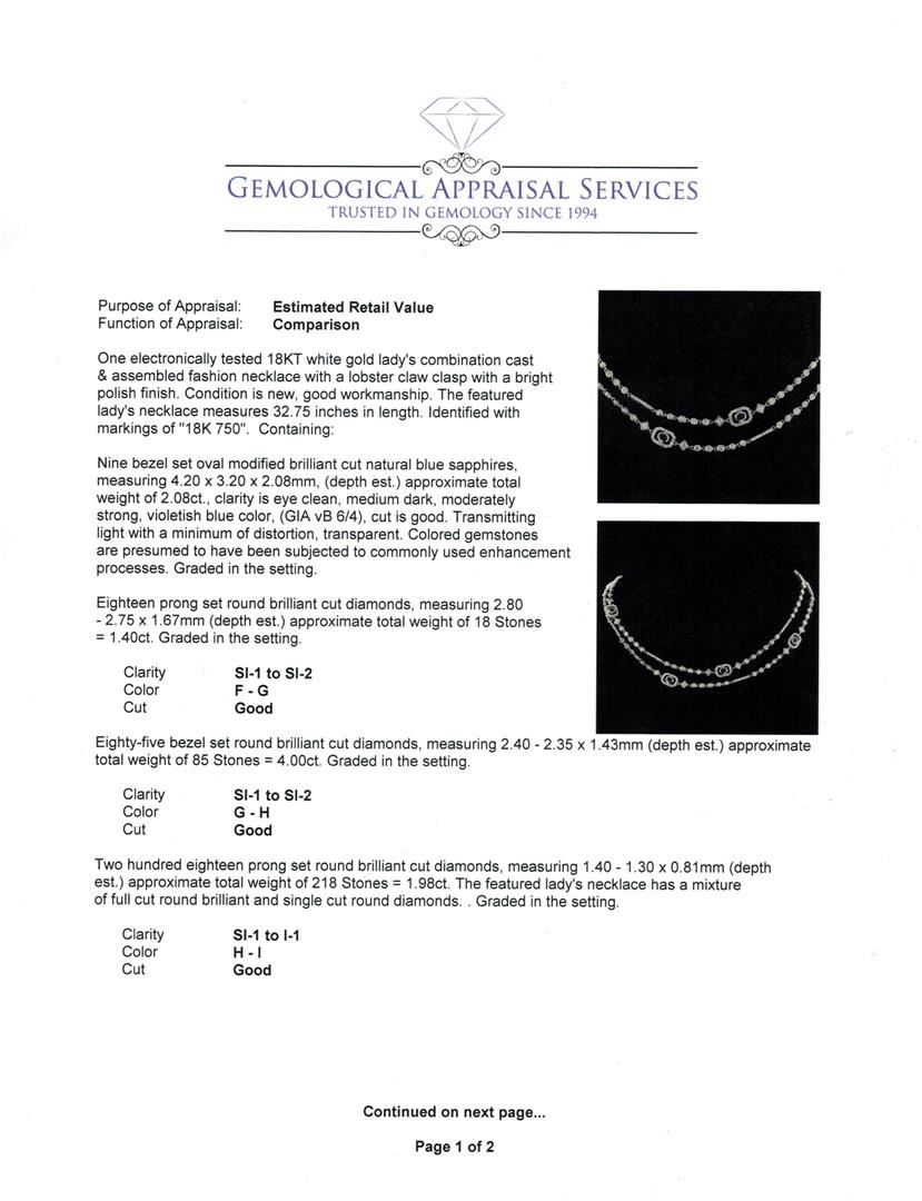 One electronically tested 18KT white gold lady's combination cast & assembled fashion necklace with a lobster claw clasp with a bright polish finish. The featured lady's necklace measures 32.75 inches in length. Identified with markings of "18K 750". Condition is new, good workmanship. Containing: Nine bezel set oval modified brilliant cut natural blue sapphires, measuring 4.20 x 3.20 x 2.08mm, (depth est.) approximate total weight of 2.08ct., clarity is eye clean, medium dark, moderately strong, violetish blue color, (GIA vB 6/4), cut is good. Transmitting light with a minimum of distortion, transparent. Colored gemstones are presumed to have been subjected to commonly used enhancement processes. Graded in the setting. Eighteen prong set round brilliant cut diamonds, measuring 2.80 - 2.75 x 1.67mm (depth est.) approximate total weight of 18 Stones = 1.40ct. Graded in the setting. Clarity: SI-1 to SI-2. Color: F - Good Eighty-Five bezel set round brilliant cut diamonds, measuring 2.40 - 2.35 x 1.43mm (depth est.) approximate total weight of 85 Stones = 4.00ct. Graded in the setting. Clarity: SI-1 to SI-2. Color: G - Good Two Hundred Eighteen prong set round brilliant cut diamonds, measuring 1.40 - 1.30 x 0.81mm (depth est.) approximate total weight of 218 Stones = 1.98ct. The featured lady's necklace has a mixture of full cut round brilliant and single cut round diamonds. Graded in the setting. Clarity: SI-1 to I-1. Color: H - I. Cut Good. Total Weight of Colored Stones 2.08ct. Total Weight of Diamonds 7.38ct. Total Weight of Necklace 29.70gm. GAS Appraised at $23,975.00.