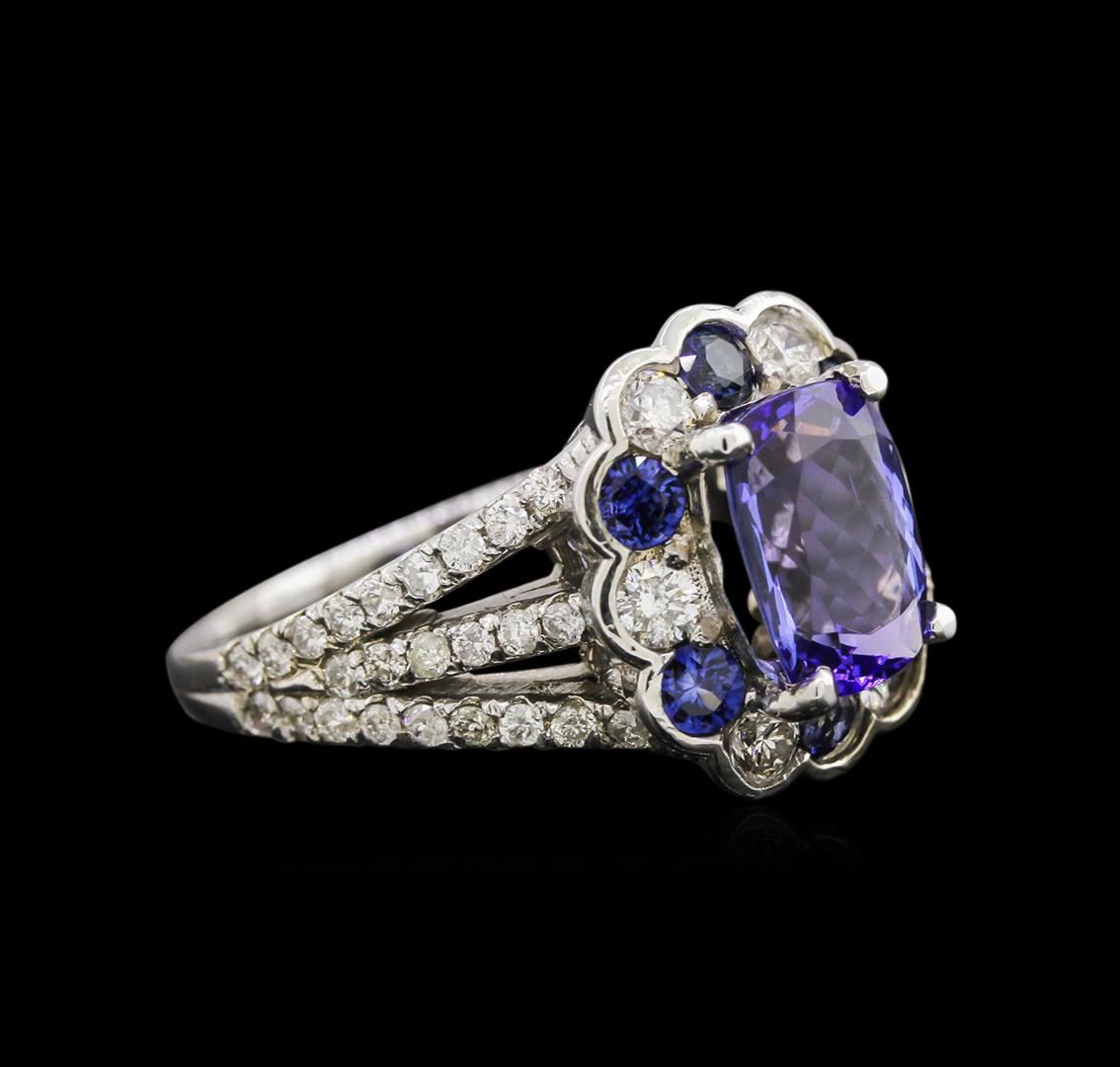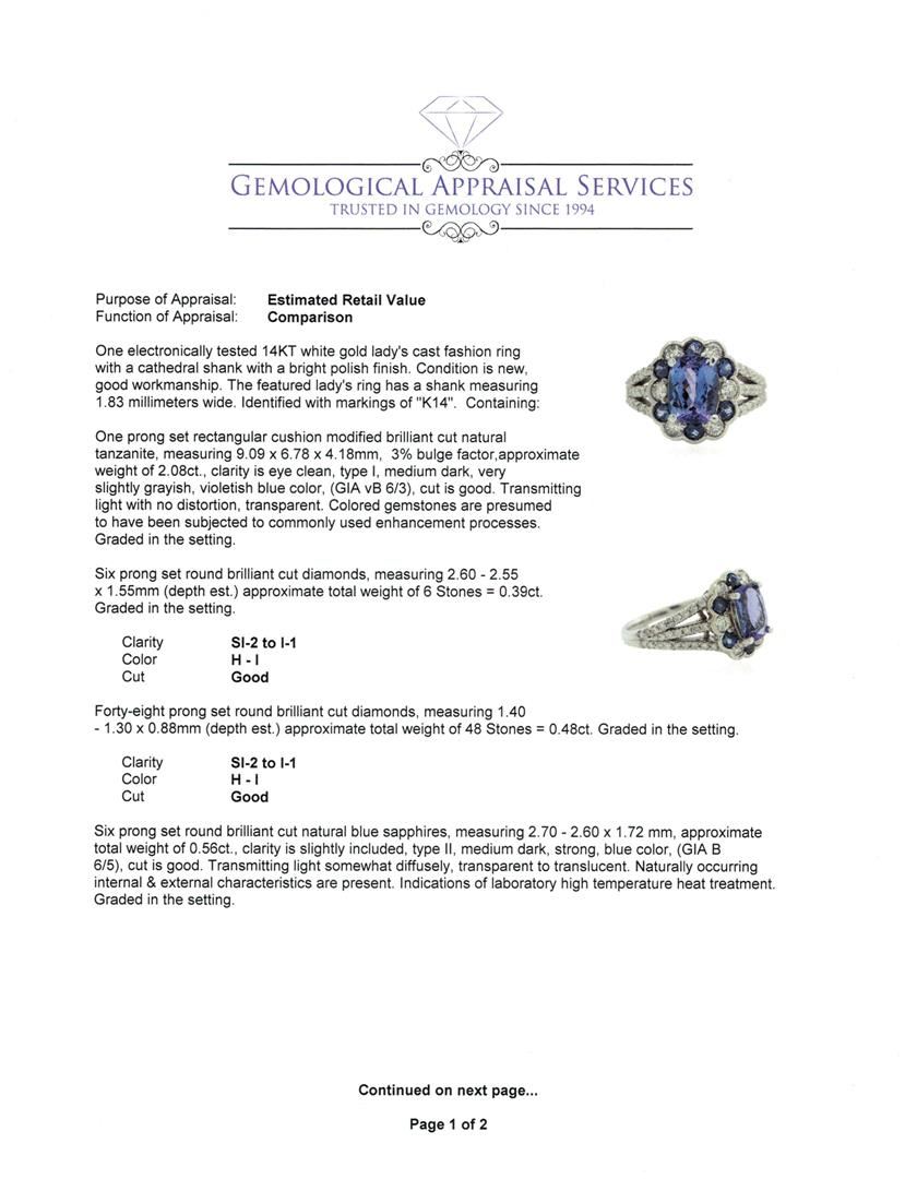 One electronically tested 14KT white gold lady's cast fashion ring with a cathedral shank with a bright polish finish. The featured lady's ring has a shank measuring 1.83 millimeters wide. Identified with markings of "K14". Condition is new, good workmanship. Containing: One prong set rectangular cushion modified brilliant cut natural tanzanite, measuring 9.09 x 6.78 x 4.18mm, 3% bulge factor, approximate weight of 2.08ct., clarity is eye clean, type I, medium dark, very slightly grayish, violetish blue color, (GIA vB 6/3), cut is good. Transmitting light with no distortion, transparent. Colored gemstones are presumed to have been subjected to commonly used enhancement processes. Graded in the setting. Six prong set round brilliant cut diamonds, measuring 2.60 - 2.55 x 1.55mm (depth est.) approximate total weight of 6 Stones = 0.39ct. Graded in the setting. Clarity: SI-2 to I-1. Color: H - I. Cut Good Forty-Eight prong set round brilliant cut diamonds, measuring 1.40 - 1.30 x 0.88mm (depth est.) approximate total weight of 48 Stones = 0.48ct. Graded in the setting. Clarity: SI-2 to I-1. Color: H - I. Cut Good Six prong set round brilliant cut natural blue sapphires, measuring 2.70 - 2.60 x 1.72 mm, approximate total weight of 0.56ct., clarity is slightly included, type II, medium dark, strong, blue color, (GIA B 6/5), cut is good. Transmitting light somewhat diffusely, transparent to translucent. Naturally occurring internal & external characteristics are present. Indications of laboratory high temperature heat treatment. Graded in the setting. Total Weight of Colored Stones 2.64ct. Total Weight of Diamonds 0.87ct. Total Weight of Ring 5.90gm. GAS Appraised at $6,275.00.