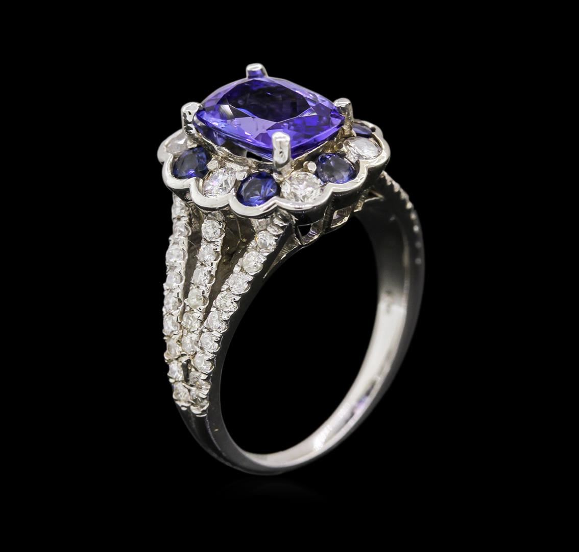 One electronically tested 14KT white gold lady's cast fashion ring with a cathedral shank with a bright polish finish. The featured lady's ring has a shank measuring 1.83 millimeters wide. Identified with markings of "K14". Condition is new, good workmanship. Containing: One prong set rectangular cushion modified brilliant cut natural tanzanite, measuring 9.09 x 6.78 x 4.18mm, 3% bulge factor, approximate weight of 2.08ct., clarity is eye clean, type I, medium dark, very slightly grayish, violetish blue color, (GIA vB 6/3), cut is good. Transmitting light with no distortion, transparent. Colored gemstones are presumed to have been subjected to commonly used enhancement processes. Graded in the setting. Six prong set round brilliant cut diamonds, measuring 2.60 - 2.55 x 1.55mm (depth est.) approximate total weight of 6 Stones = 0.39ct. Graded in the setting. Clarity: SI-2 to I-1. Color: H - I. Cut Good Forty-Eight prong set round brilliant cut diamonds, measuring 1.40 - 1.30 x 0.88mm (depth est.) approximate total weight of 48 Stones = 0.48ct. Graded in the setting. Clarity: SI-2 to I-1. Color: H - I. Cut Good Six prong set round brilliant cut natural blue sapphires, measuring 2.70 - 2.60 x 1.72 mm, approximate total weight of 0.56ct., clarity is slightly included, type II, medium dark, strong, blue color, (GIA B 6/5), cut is good. Transmitting light somewhat diffusely, transparent to translucent. Naturally occurring internal & external characteristics are present. Indications of laboratory high temperature heat treatment. Graded in the setting. Total Weight of Colored Stones 2.64ct. Total Weight of Diamonds 0.87ct. Total Weight of Ring 5.90gm. GAS Appraised at $6,275.00.