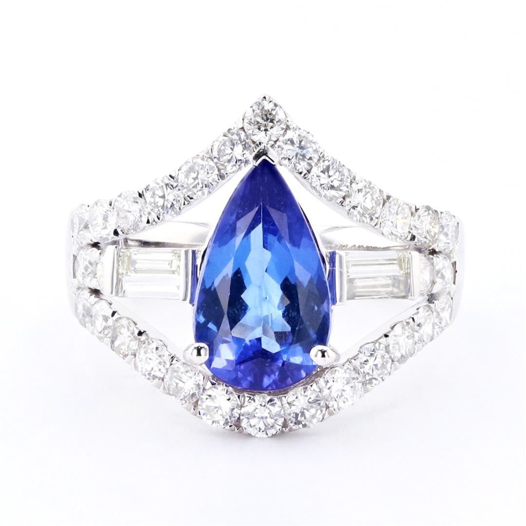 2.08ct Tanzanite and 1.51ctw Diamond 14K White Gold Ring. Please see Photos and Description for all available information. This stunning ring features a 2.08ct oval tanzanite center stone surrounded by 34 round diamonds with a total weight of 1.51ct. The oval tanzanite is set in a 14K white gold ring and encircled with round diamonds and finished with high polished edges. This ring is available in size 6 3/4