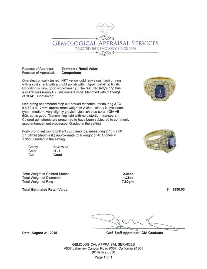 One electronically tested 14KT yellow gold lady's cast fashion ring with a split shank with a bright polish with milgrain detailing finish. The featured lady's ring has a shank measuring 4.25 millimeters wide. Identified with markings of "K14". Condition is new, good workmanship. Containing: One prong set emerald step cut natural tanzanite, measuring 8.73 x 6.52 x 4.17mm, approximate weight of 2.08ct., clarity is eye clean, type I, medium, very slightly grayish, violetish blue color, (GIA vB 5/3), cut is good. Transmitting light with no distortion, transparent. Colored gemstones are presumed to have been subjected to commonly used enhancement processes. Graded in the setting. Forty prong set round brilliant cut diamonds, measuring 2.10 - 2.00 x 1.31mm (depth est.) approximate total weight of 40 Stones = 1.35ct. Graded in the setting. Clarity: SI-2 to I-1. Color: H - I. Cut Good. Total Weight of Colored Stones 2.08ct. Total Weight of Diamonds 1.35ct. Total Weight of Ring 7.60gm. GAS Appraised.