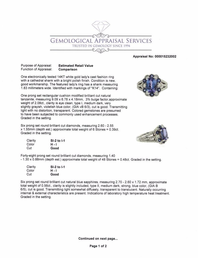 One electronically tested 14KT white gold lady's cast fashion ring with a cathedral shank with a bright polish finish. The featured lady's ring has a shank measuring 1.83 millimeters wide. Identified with markings of "K14". Condition is new, good workmanship. Containing: One prong set rectangular cushion modified brilliant cut natural tanzanite, measuring 9.09 x 6.78 x 4.18mm, 3% bulge factor, approximate weight of 2.08ct., clarity is eye clean, type I, medium dark, very slightly grayish, violetish blue color, (GIA vB 6/3), cut is good. Transmitting light with no distortion, transparent. Colored gemstones are presumed to have been subjected to commonly used enhancement processes. Graded in the setting. Six prong set round brilliant cut diamonds, measuring 2.60 - 2.55 x 1.55mm (depth est.) approximate total weight of 6 Stones = 0.39ct. Graded in the setting. Clarity: SI-2 to I-1. Color: H - I. Cut Good Forty-Eight prong set round brilliant cut diamonds, measuring 1.40 - 1.30 x 0.88mm (depth est.) approximate total weight of 48 Stones = 0.48ct. Graded in the setting. Clarity: SI-2 to I-1. Color: H - I. Cut Good Six prong set round brilliant cut natural blue sapphires, measuring 2.70 - 2.60 x 1.72 mm, approximate total weight of 0.56ct., clarity is slightly included, type II, medium dark, strong, blue color, (GIA B 6/5), cut is good. Transmitting light somewhat diffusely, transparent to translucent. Naturally occurring internal & external characteristics are present. Indications of laboratory high temperature heat treatment. Graded in the setting. Total Weight of Colored Stones 2.64ct. Total Weight of Diamonds 0.87ct. Total Weight of Ring 5.90gm. GAS Appraised at $6,275.00.