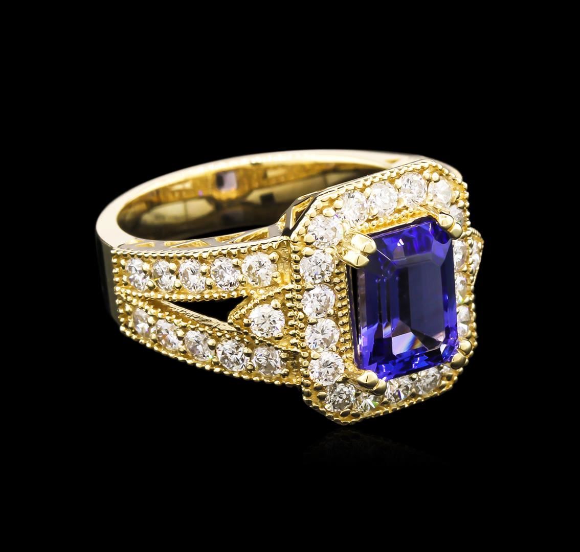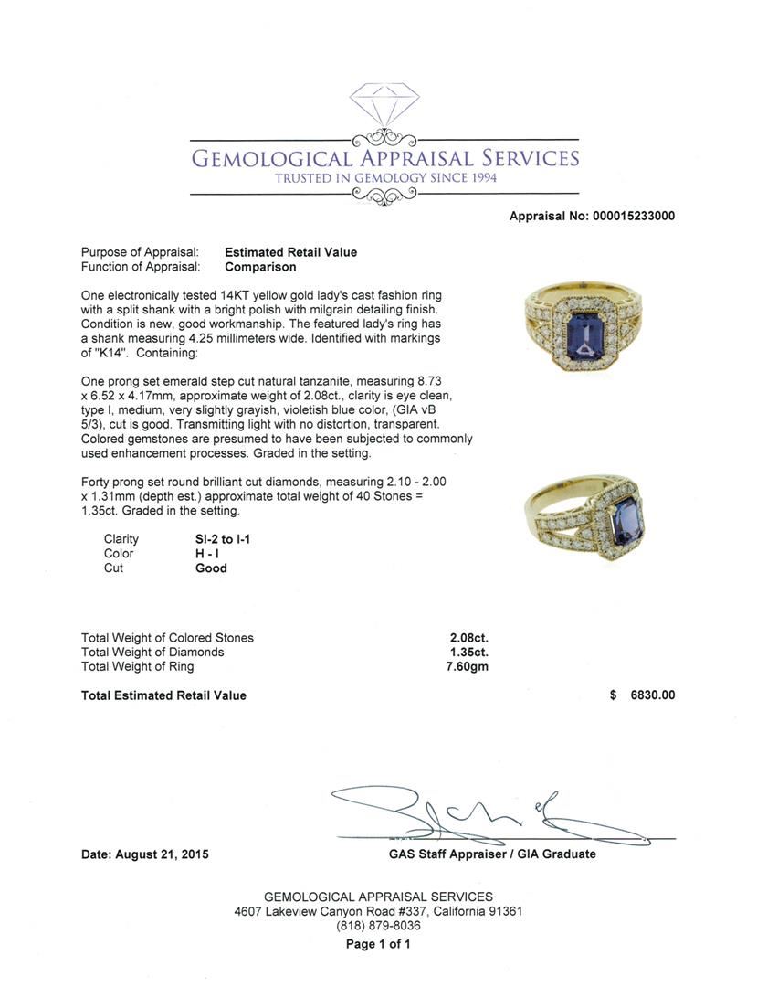 One electronically tested 14KT yellow gold lady's cast fashion ring with a split shank with a bright polish with milgrain detailing finish. The featured lady's ring has a shank measuring 4.25 millimeters wide. Identified with markings of "K14". Condition is new, good workmanship. Containing: One prong set emerald step cut natural tanzanite, measuring 8.73 x 6.52 x 4.17mm, approximate weight of 2.08ct., clarity is eye clean, type I, medium, very slightly grayish, violetish blue color, (GIA vB 5/3), cut is good. Transmitting light with no distortion, transparent. Colored gemstones are presumed to have been subjected to commonly used enhancement processes. Graded in the setting. Forty prong set round brilliant cut diamonds, measuring 2.10 - 2.00 x 1.31mm (depth est.) approximate total weight of 40 Stones = 1.35ct. Graded in the setting. Clarity: SI-2 to I-1. Color: H - I. Cut Good. Total Weight of Colored Stones 2.08ct. Total Weight of Diamonds 1.35ct. Total Weight of Ring 7.60gm. GAS Appraised at $6,830.00.